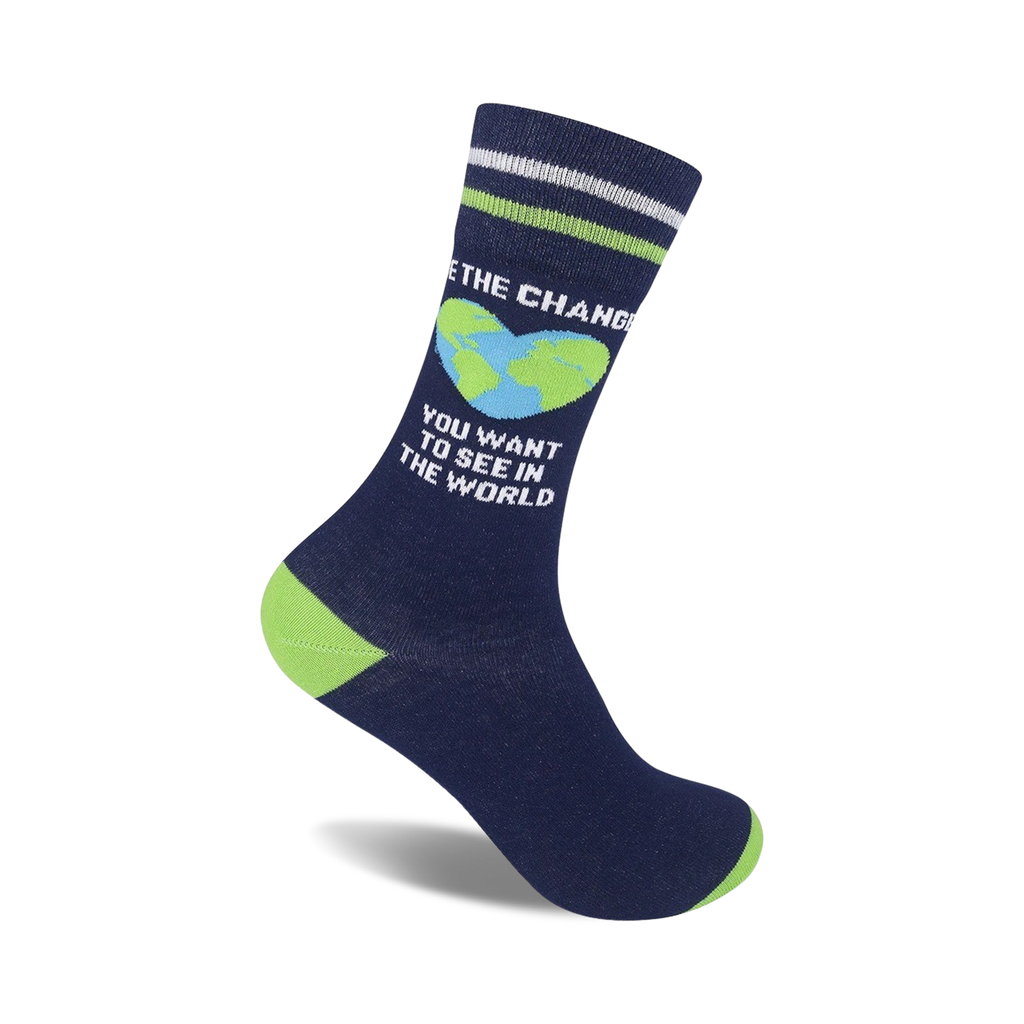 Step aside, boring socks! Our "Be The Change" socks are here to add a splash of inspiration and motivation to your everyday attire. Featuring a charming design with the words "Be The Change You Want to See in the World", these socks will remind you to spread positivity and make a difference, one step at a time. With their vibrant blue and green hues, these socks are like a visual pep talk, reminding you to embrace change and be the best version of yourself. So, slip into a pair of our "Be The Change" socks and let your feet do the talking because sometimes, all it takes is a little inspiration to create big waves of change.