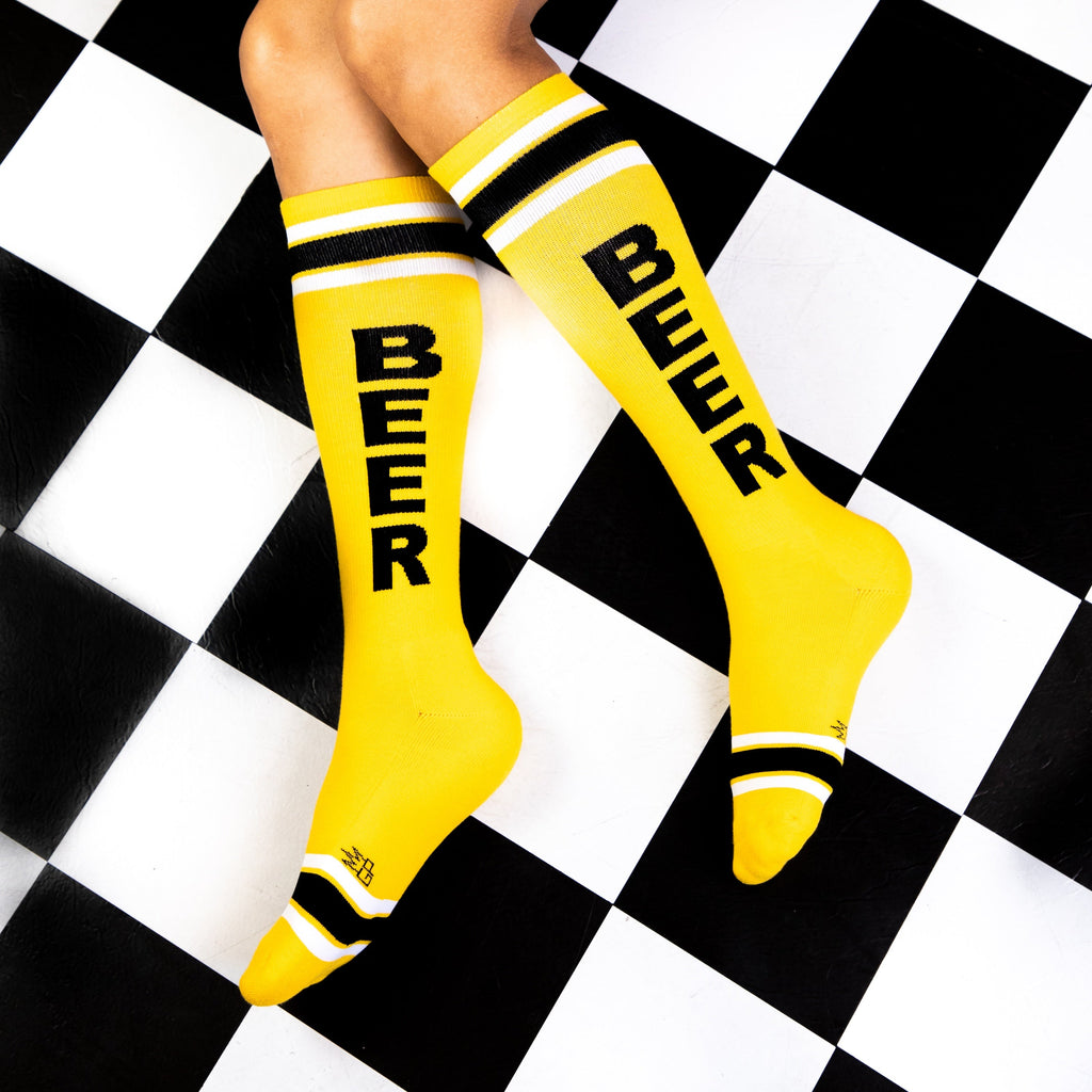 Turn your feet into foaming pint glasses with these Beer Knee High socks! These hoppy socks are the perfect way to honor your favorite beverage, and they'll definitely get a few laughs at your next party! Take a sip of style and wear them with confidence, knowing you're rocking a classic that will never go flat. Cheers to good times and great socks!