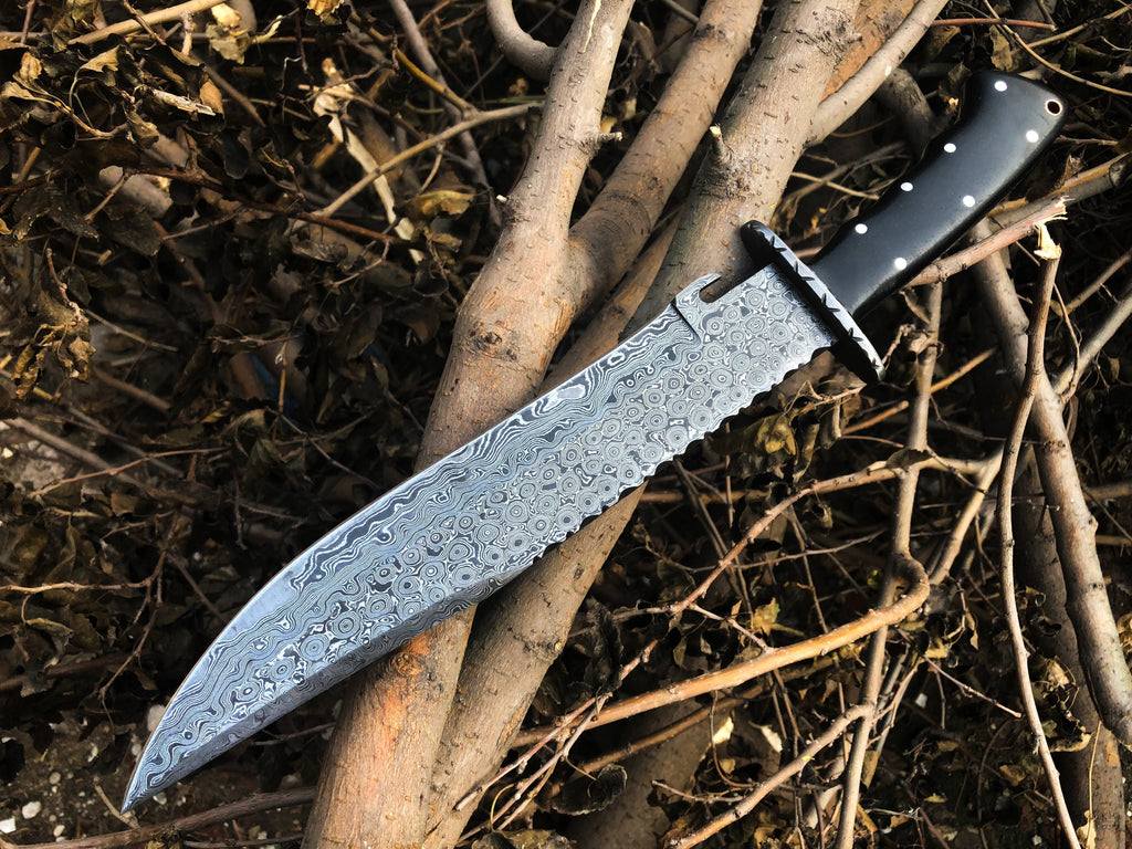 **Full Tang Raindrop Damascus Blade:** At the heart of this exceptional Bowie knife lies a full Tang Raindrop Damascus blade, meticulously crafted to perfection. Renowned for its extraordinary strength and intricate patterns, this blade delivers both aesthetic appeal and superior cutting performance. Whether you're skinning game or tackling heavy-duty tasks, it excels in every aspect.