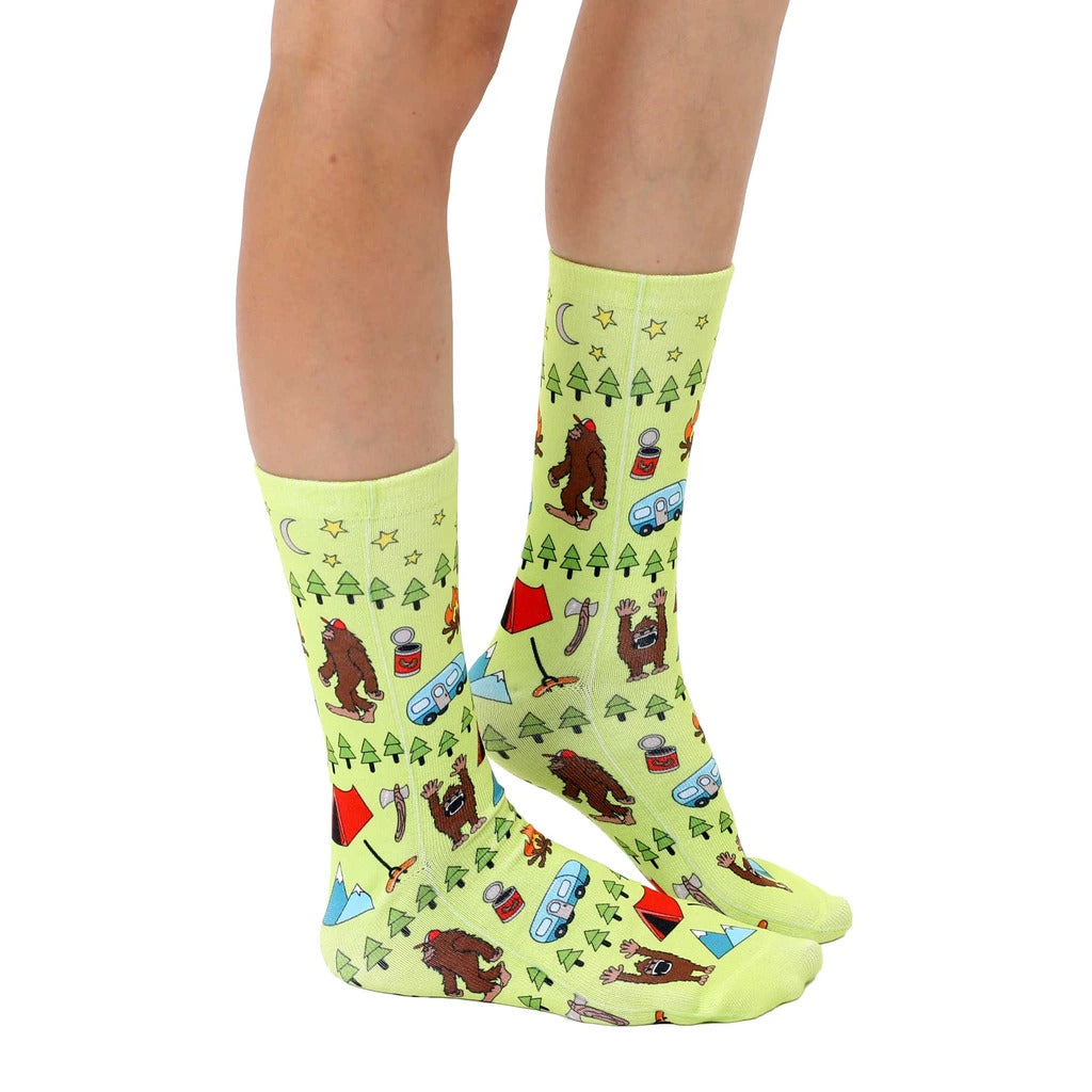 Yo, lace up your feet with these legendary Bigfoot socks! Join the elusive creature on his camping adventures through forests, mountains, and starry nights. Whether he's toasting marshmallows, snoozing in his tent, or scaling peaks, these socks will keep your toes grinning from sunrise to sunset. Bigfoot may be a mystery, but these socks are as real as it gets, making them the perfect conversation starter. Don't be a square, put on a pair and let your feet do the talking. Adventure awaits!