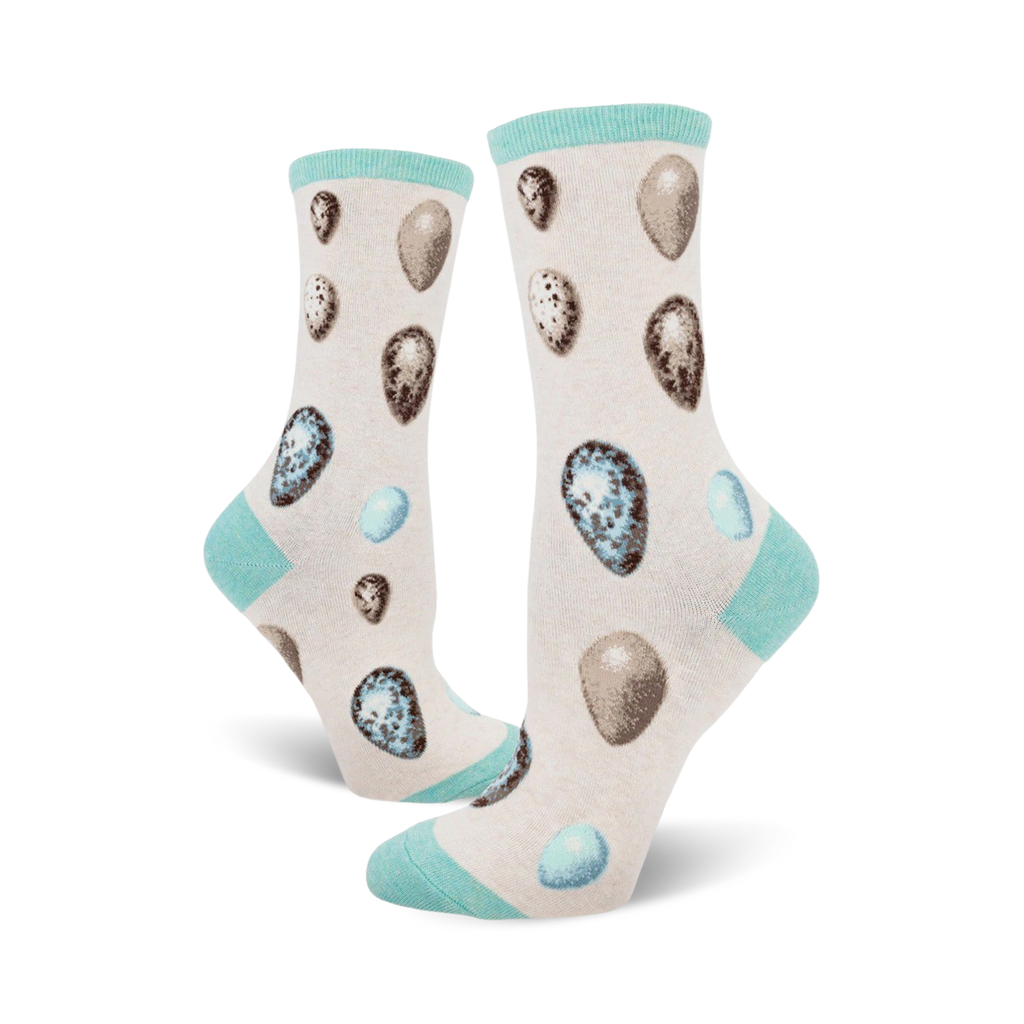 Bird Egg socks: A delightful dash of whimsy for your feet. Strut your stuff in these chirpy crew socks, showcasing a gallery of colorful eggs cozied up against a sky-blue backdrop. They're a lighthearted reminder that even the humblest beginnings can hatch into something extraordinary. Each pair is a celebration of the wonders of nature, guaranteed to crack a smile on anyone's face.