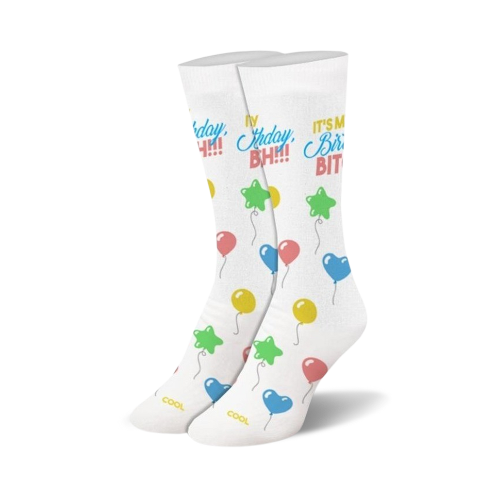 Feeling frisky on your birthday? Let these socks do the talking. Adorned with bright balloons, stars and hearts, and the words "Happy Birthday Bitch!", these crew socks will make a statement. Wear them proudly and let the world know it's your special day. Hey Google, play "B*tch Better Have My Money" by Rihanna!