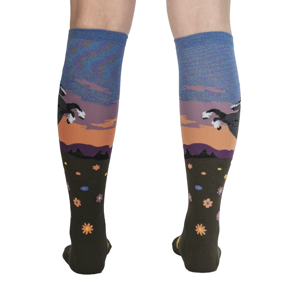 Gallop into the sunset with Black Beauty, our knee-high socks for women. These socks showcase a dark brown floral pattern with a striking black horse leaping over a fence, all set against a breathtaking purple, pink, and blue sunset. Inspired by the classic novel, these socks are just as resilient as their namesake. Wear them to remind yourself that even in the darkest of times, beauty and grace can prevail.