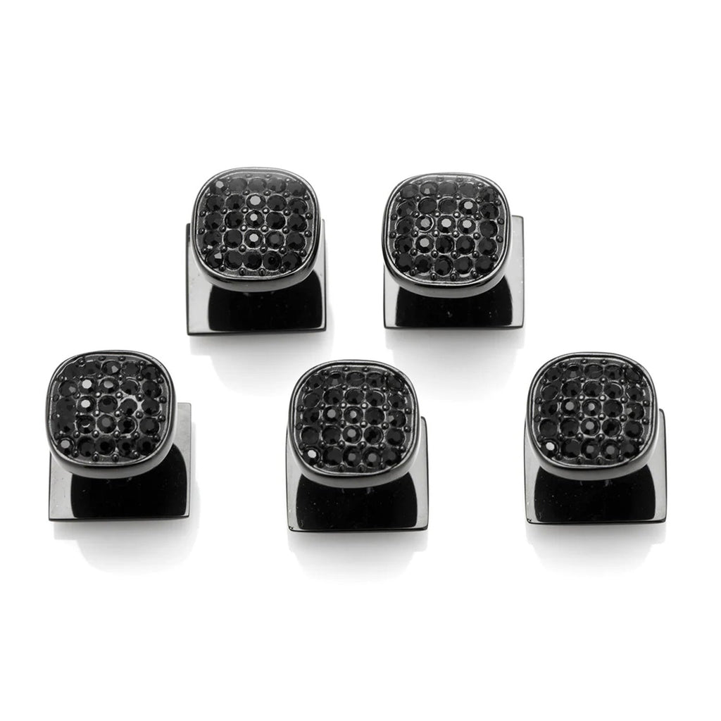 Made of black plated stainless steel with black preciosa crystals in a pave setting, these tuxedo studs are a modern and masculine take on the basic black. Pair with the Stainless Steel Black Pave Crystal Cufflinks for a complete look at your next black tie event.