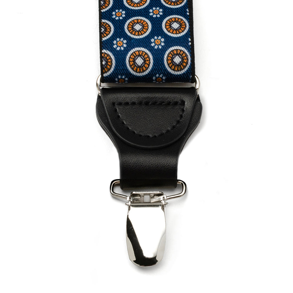 Look to tradition to create a modern, yet sophisticated style. Our Blue Motif Patterned Convertible Suspenders are designed to provide support without sacrificing comfort. The expert craftsmanship of our leather crosspatch suspenders do not restrict movement and will remain in place without slipping or having to adjust. Suspenders add a unique and versatile look that can be dressed up with a suit, or dressed down with jeans and a blazer.
