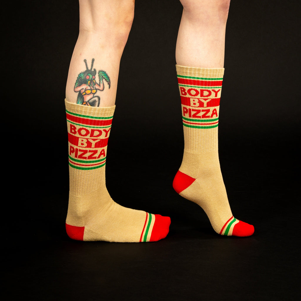 Channel your inner pizza lover with these Body By Pizza socks! Featuring a blend of tan, red, and green, these crew-length socks boast a delightful pattern of bold red and green stripes, along with "Body By Pizza" written in a fun font. Whether you're a pizza aficionado or simply seeking a slice of fun, these socks are the perfect way to add a touch of pizzazz to your feet.