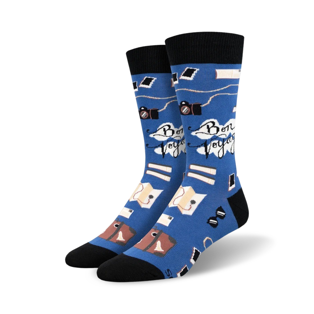 Wanderlust-inspired Bon Voyage socks featuring luggage, sunglasses, cameras, and books to fuel your next adventure. Blue skies and smooth sailing with these crew sock staples. The perfect gift for the frequent flyer. You won't be grounded with these socks. Crew up your style with Bon Voyage socks and let the good times roll. You'll be the toast of any trip, no jet lag needed!