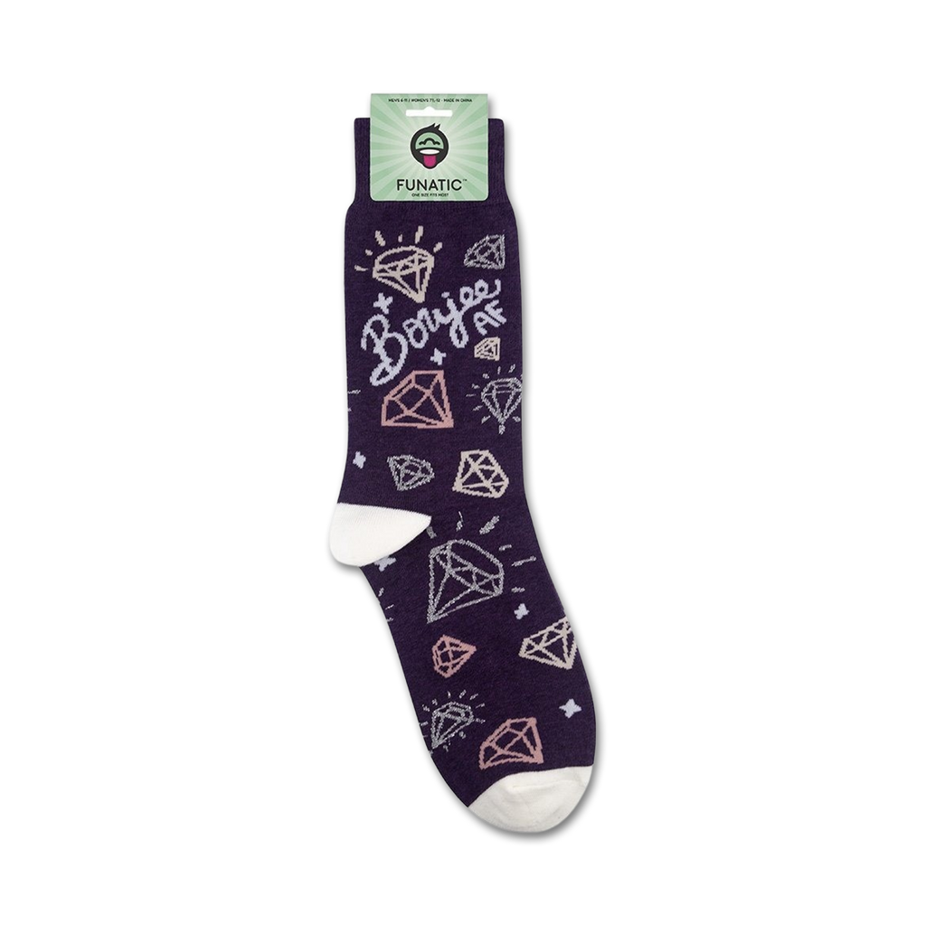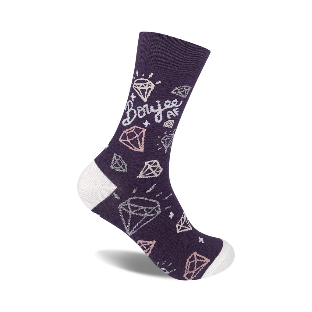 Forget boring socks! Are you looking for some socks that are as extra as you are? Boujee AF socks are the answer! These purple crew socks, featuring the phrase "Boujee AF" in pink script surrounded by glittering diamonds, are perfect for anyone who wants to add a little luxury to their everyday life. Seriously, go ahead, bring the opulence!