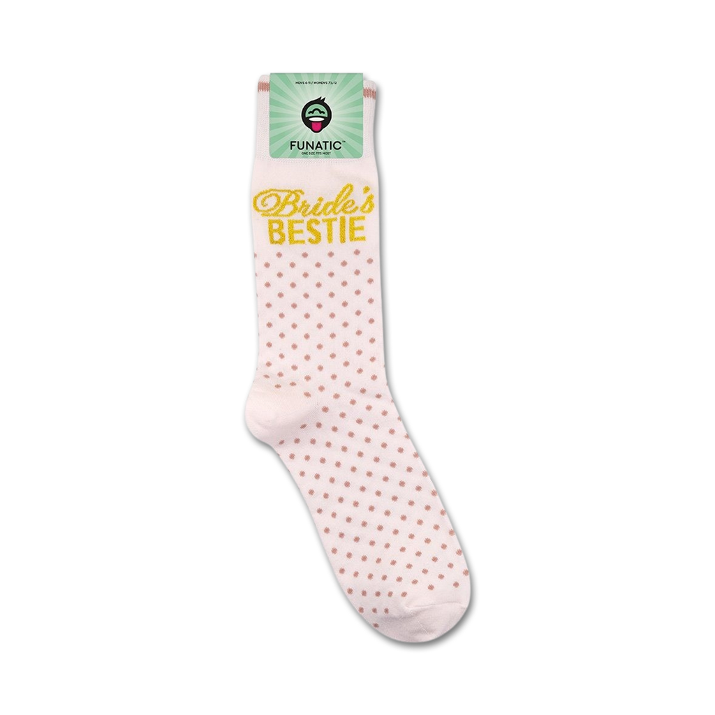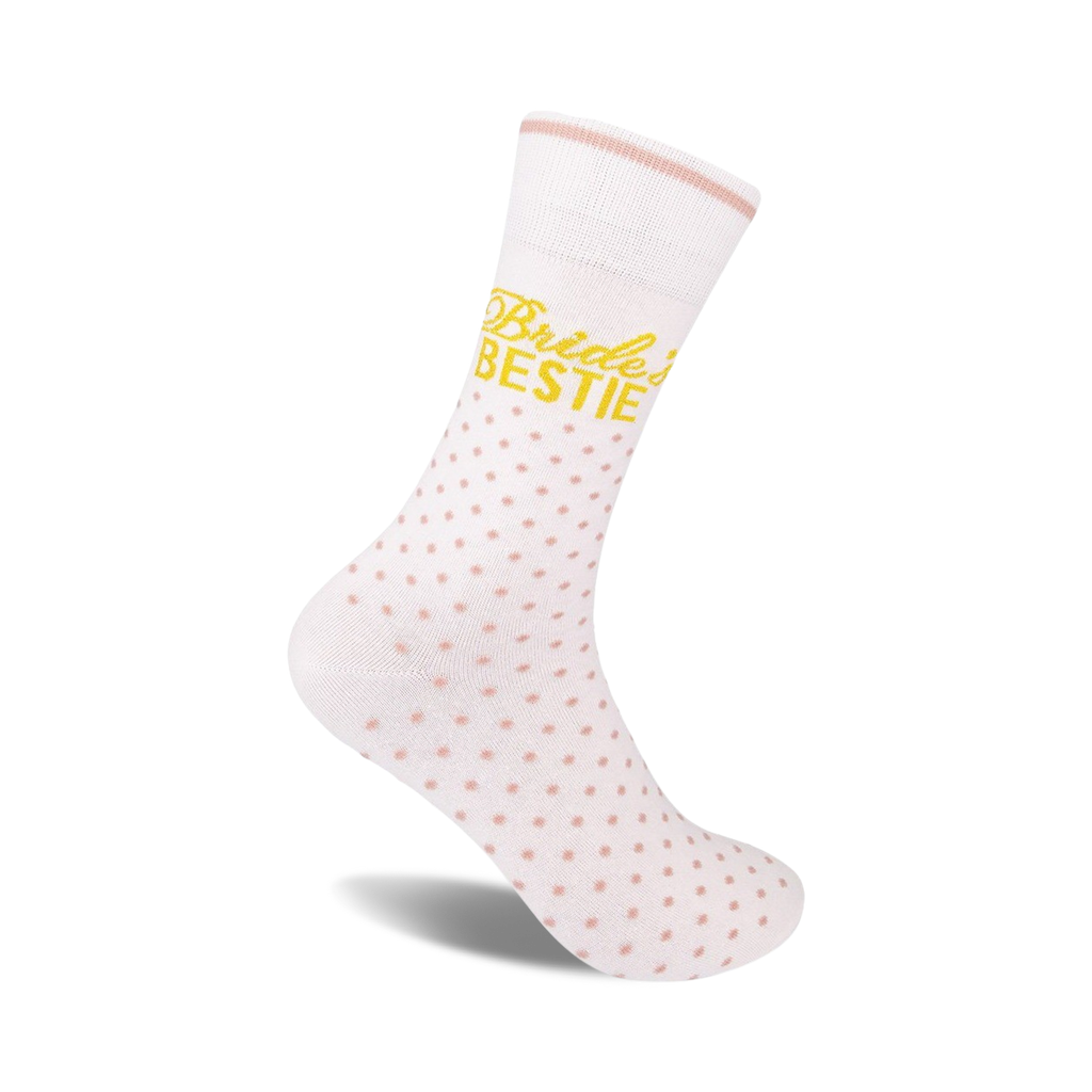 Bride's Besties! Prepare to waltz down the aisle in style with these playful pink polka dot socks, featuring the words "Bride's Bestie" in cheerful yellow text. These crew-length socks will make you the flock star of the wedding. Bridesmaids, flower girls, and besties alike will love these fun, festive socks that are sure to bring a smile to everyone's face.