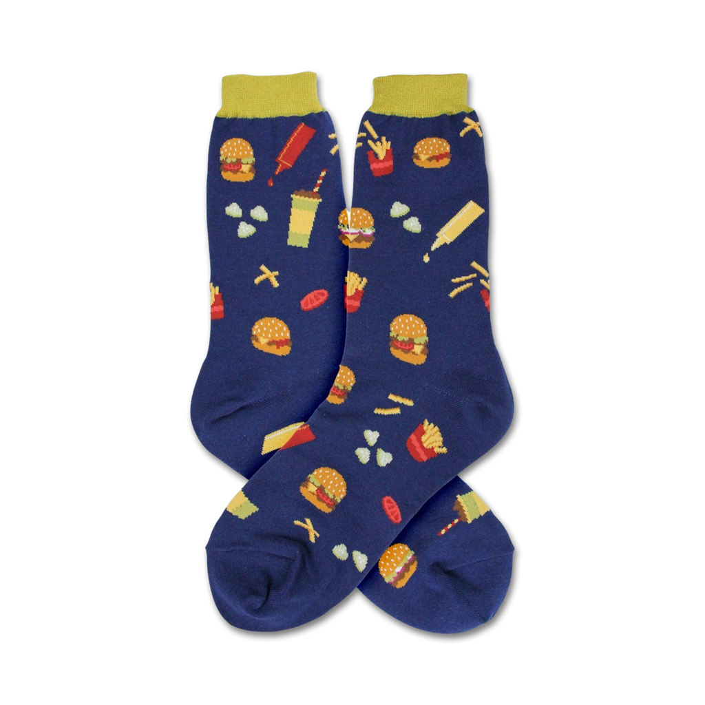 Craving some tasty fashion with a side of fun? Look no further than our Burgers socks! Picture this: a dark blue backdrop adorned with a ketchup-stained fast food feast. Burgers, fries, and condiments galore, all served up in deliciously soft, durable cotton. These socks aren't just a fashion statement; they're a tasty tribute to your favorite flavors. So go ahead, indulge in your sock-wearing cravings and let your feet do the feasting.