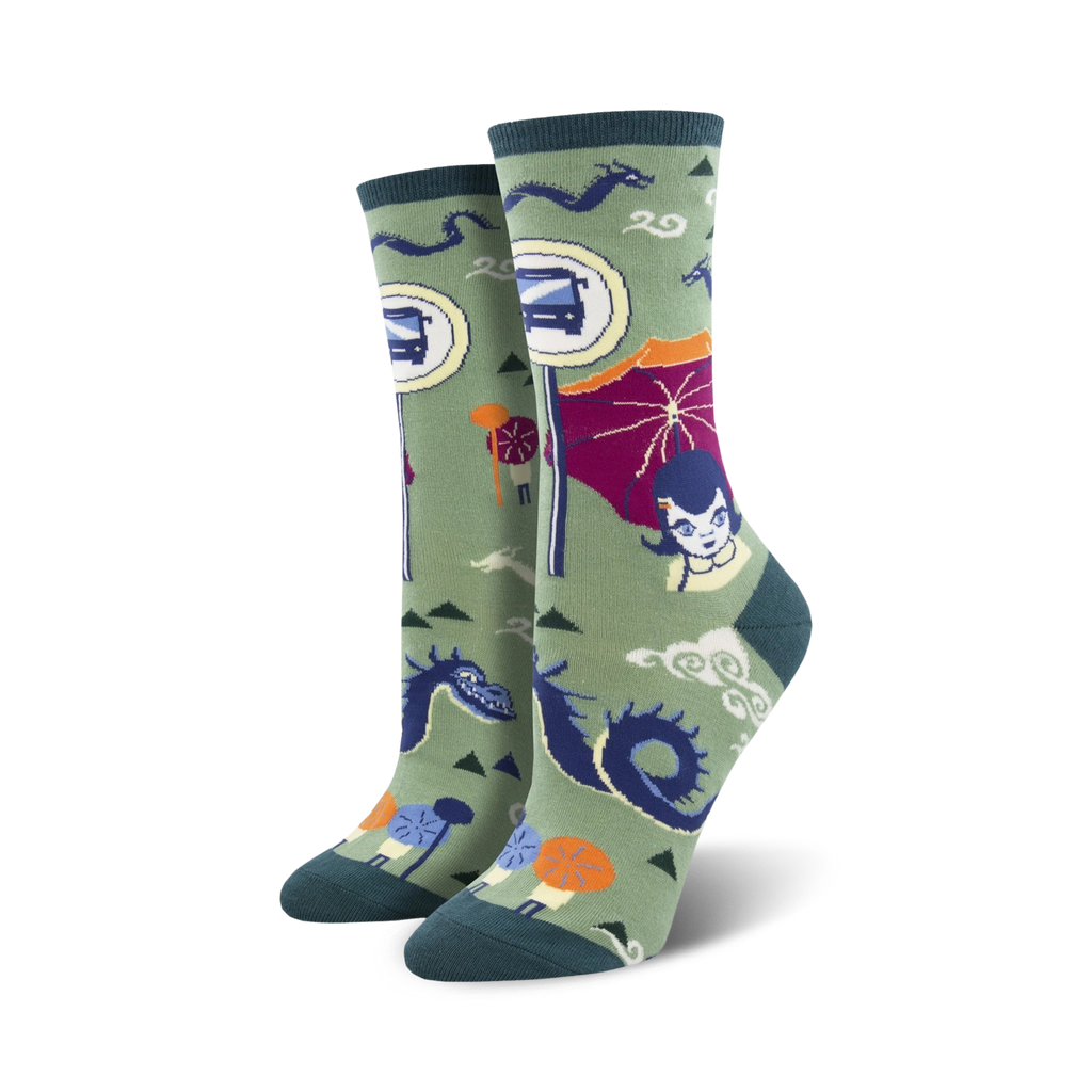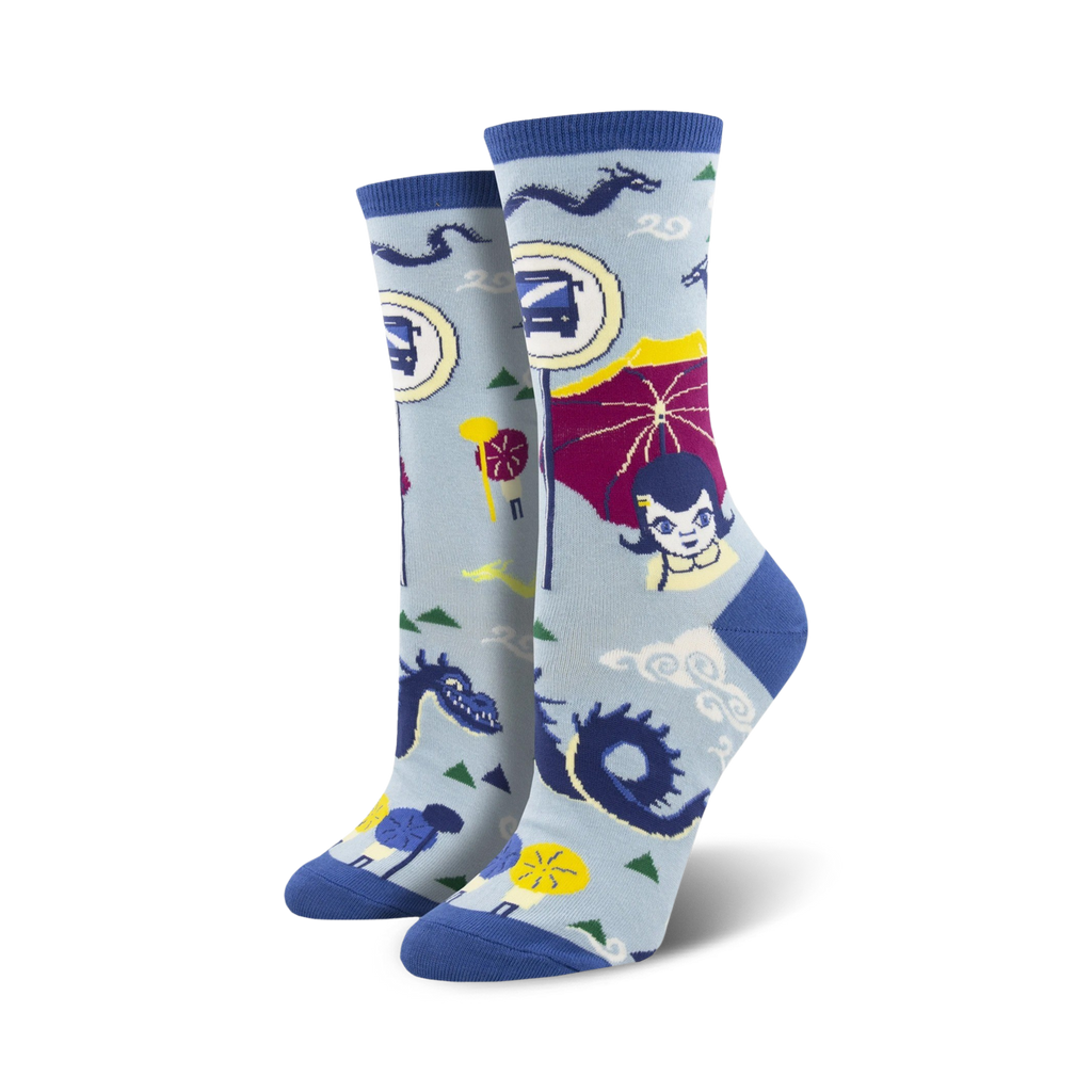 Hop on the bus to Funky Town with these crew socks for women. These playful blue socks feature a whimsical pattern of buses, clouds, dragons, and a girl in a traditional Chinese dress holding a yellow umbrella. Perfect for adding a touch of fun to your everyday style. They'll have you feeling as free as a bird, even when you're stuck at the bus stop.
