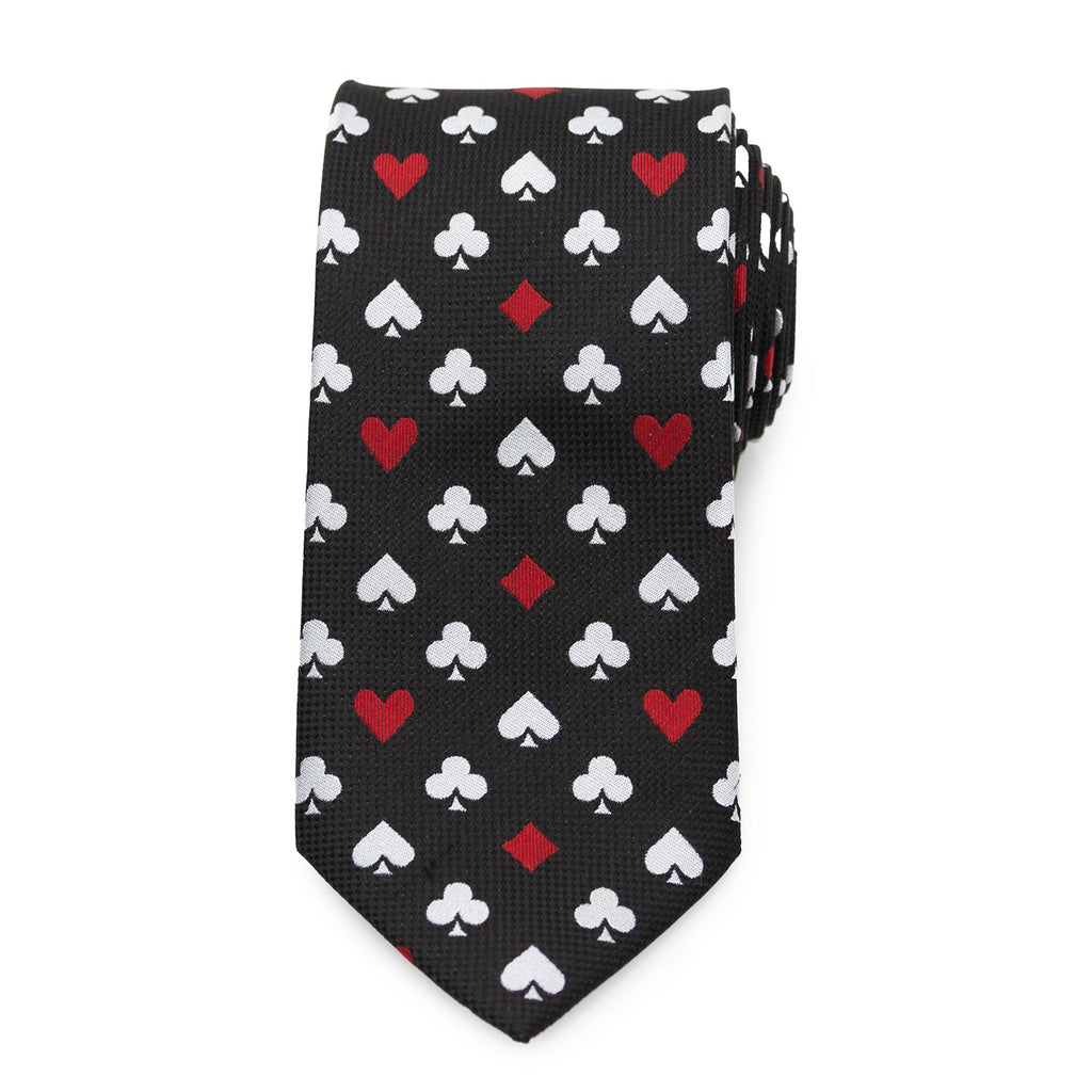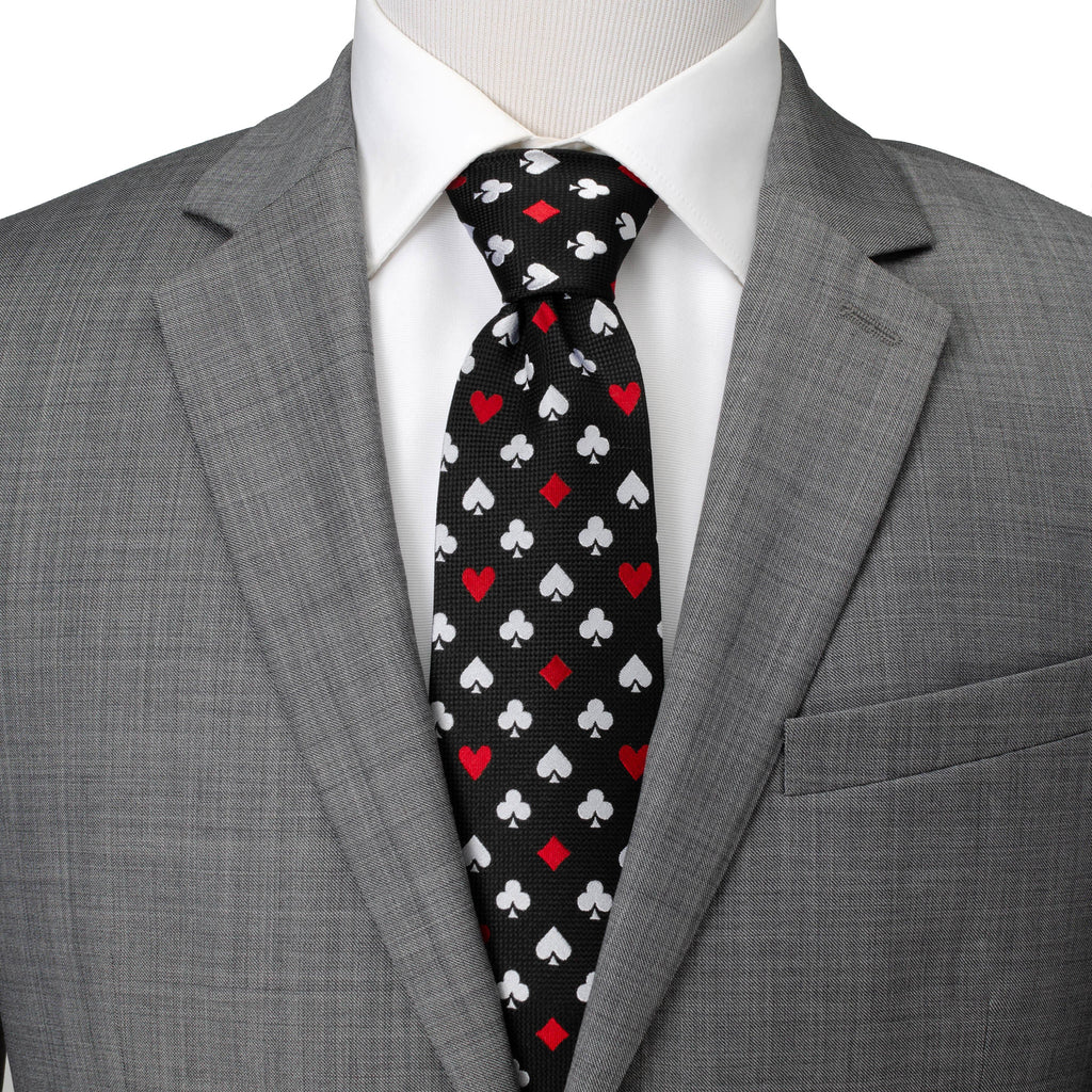 This bold black tie is peppered with classic red and white playing card suits - hearts, spades, diamonds, and clubs - for a look that channels all the thrill of the Vegas strip. Hidden just beneath the back is a cheeky embroidered message: “What Happens in Vegas, Stays in Vegas.” A secret only you (and maybe the pit boss) will know. Perfect for poker nights, bachelor parties, or your next lucky streak.