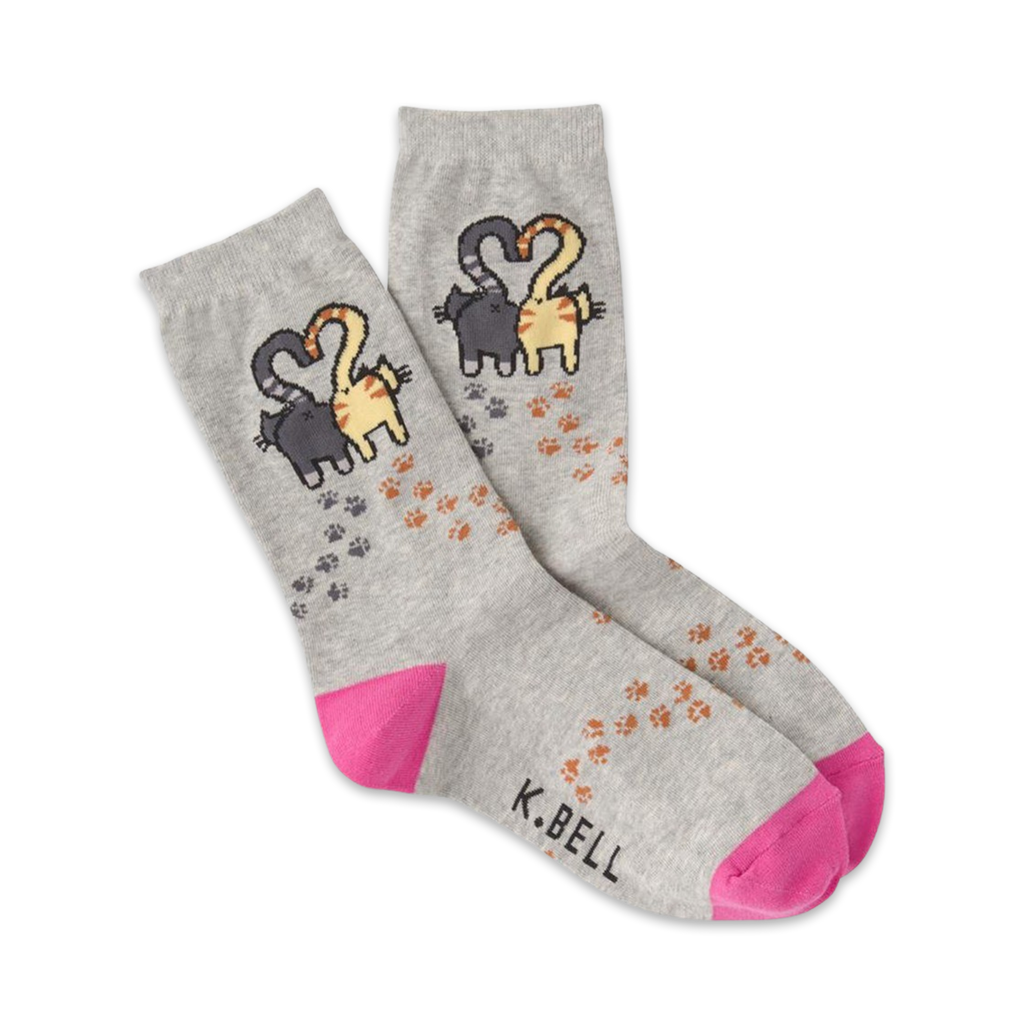 The Cat Love Socks are the purrfect way to show your feline devotion! These gray socks with black and orange cat butts arranged in a heart shape, paw prints, and pink toes and heels are sure to make you feel like the cat's meow! Wear these crew socks next time you need a reminder that even the smallest creatures can have big hearts!