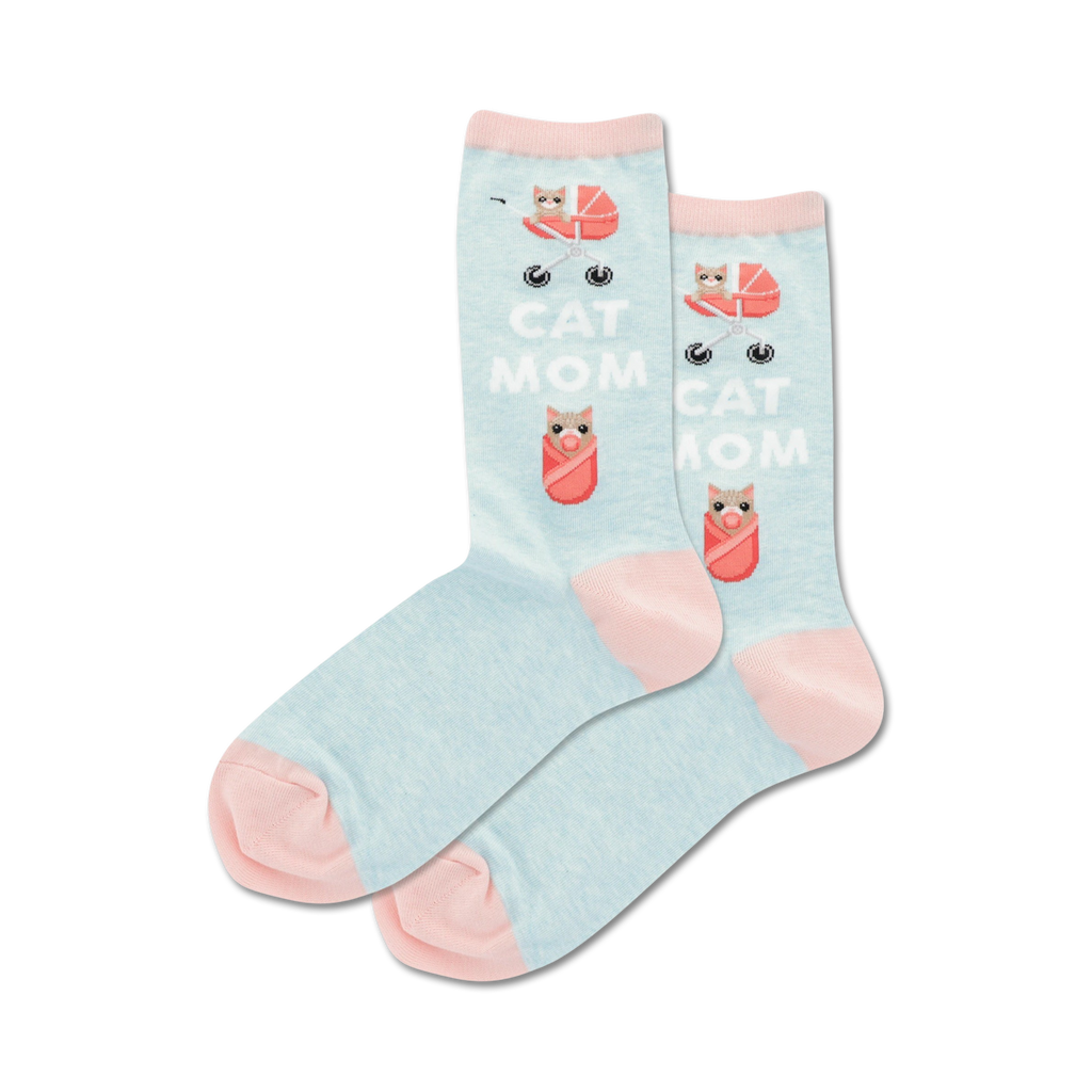 Cat Mom Socks: Purrfectly Pawsome! Strut your stuff with these Cat Mom socks, featuring cute cats pushing tiny human babies in strollers! Show off your love for felines and motherhood with these fun and light blue socks with pink accents. These crew-length socks are perfect for any cat mom who wants to add a touch of whimsy to her everyday style.