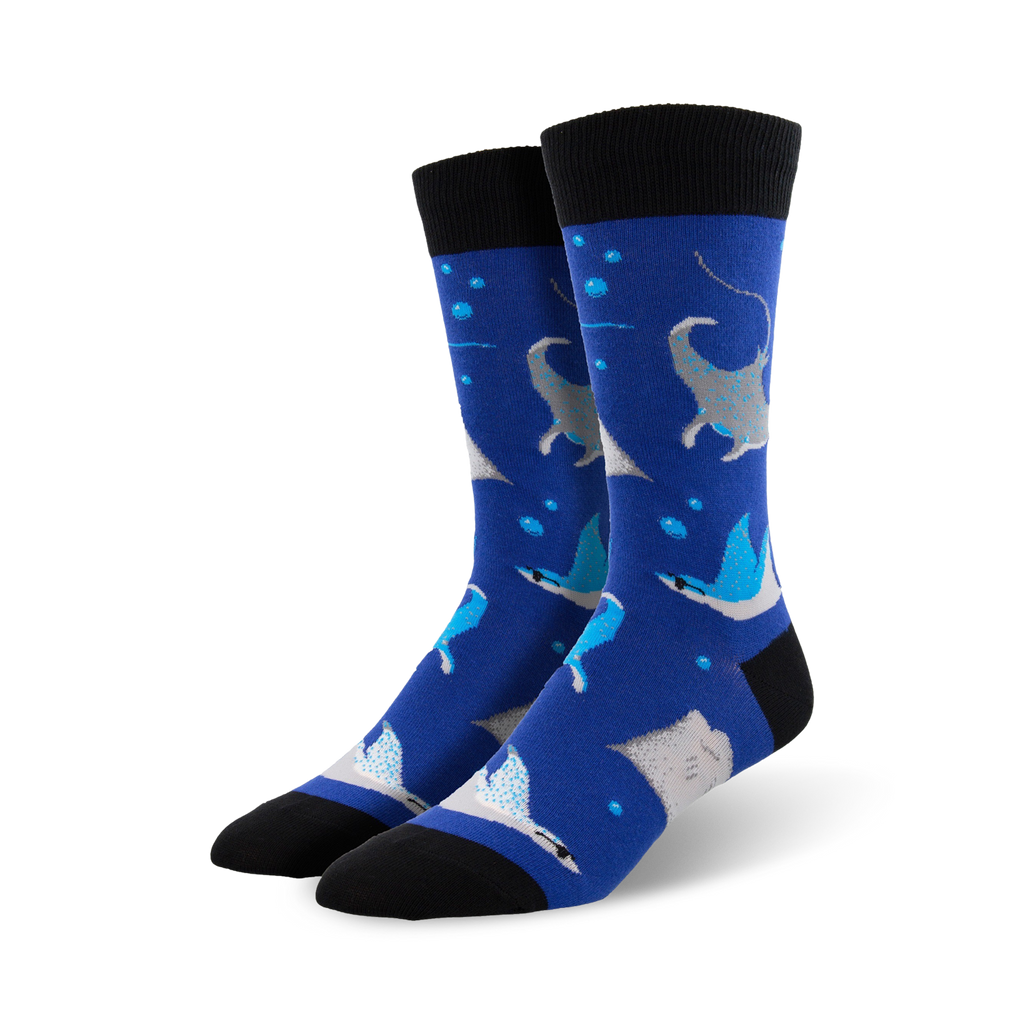 Manta rays, those graceful giants of the sea, now grace your feet with Catching Some Rays socks! Dive into the deep blue with manta rays swimming through bubbles in dark gray and light blue. Wear manta ray socks on your next adventure, whether it's walking the beach or hanging ten on a surfboard. Be reminded of the ocean's beauty with every step!