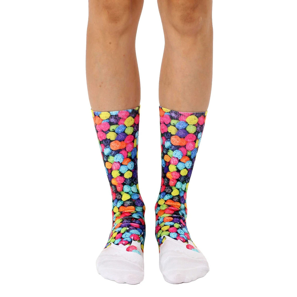 Cerealously Fun Socks: These novelty socks feature a colorful array of ball-shaped cereal pieces in blue, pink, yellow, and green, scattered on a white background. Just like your favorite cereal, these socks bring sweetness and quirkiness to your style. Wear them for breakfast, lunch, or dinner and add a dash of cereal-inspired joy to any outfit.