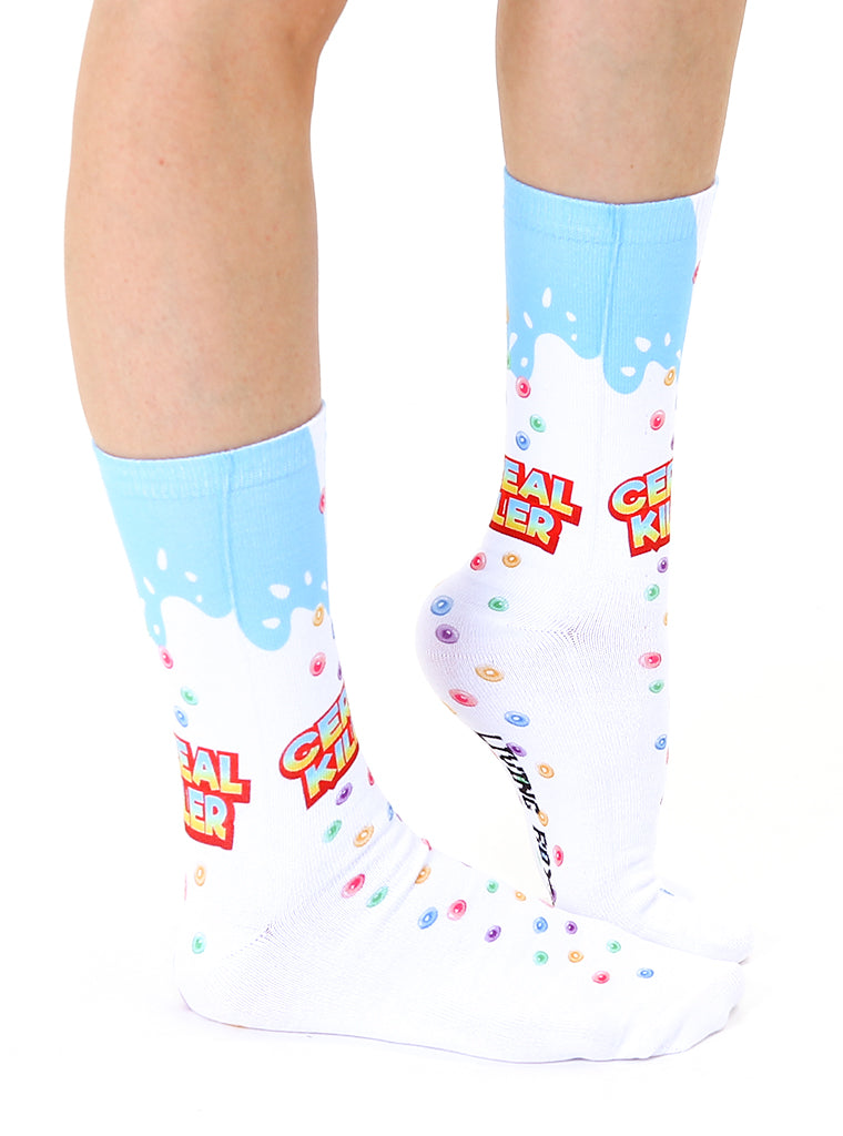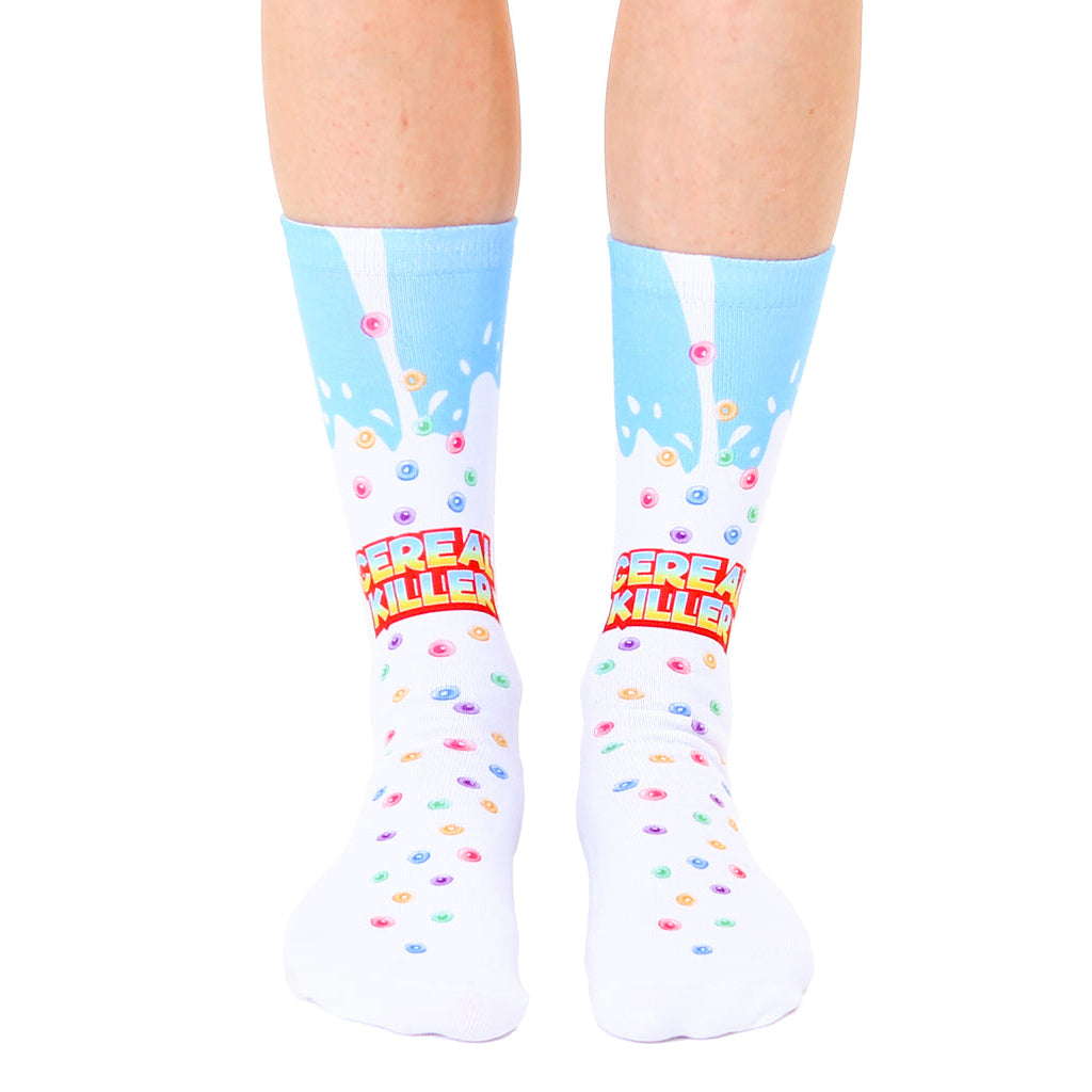 Attention cereal fanatics: meet your new favorite accessory. With a pattern of colorful cereal pieces and the notorious words 'Cereal Killer' adorning each sock, these socks are just the thing to add a dash of fun to your morning routine. Who says breakfast can't be fashionable? Get your hands on a pair and turn your feet into breakfast bowls!