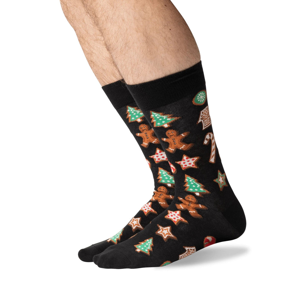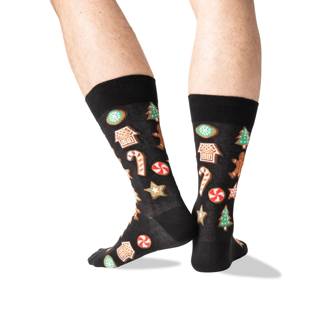 These 'Christmas Cookies' socks are a fun way to add some holiday cheer to your outfit. The visible portion shows a teal pair with a festive pattern of gingerbread men, candy canes, stars, and little Christmas trees. Another shown color is black, featuring the same cookie-themed design. They're crew socks, and the pattern is randomly scattered across the fabric. Perfect for cozying up by the fire or adding a touch of whimsy to your holiday look.