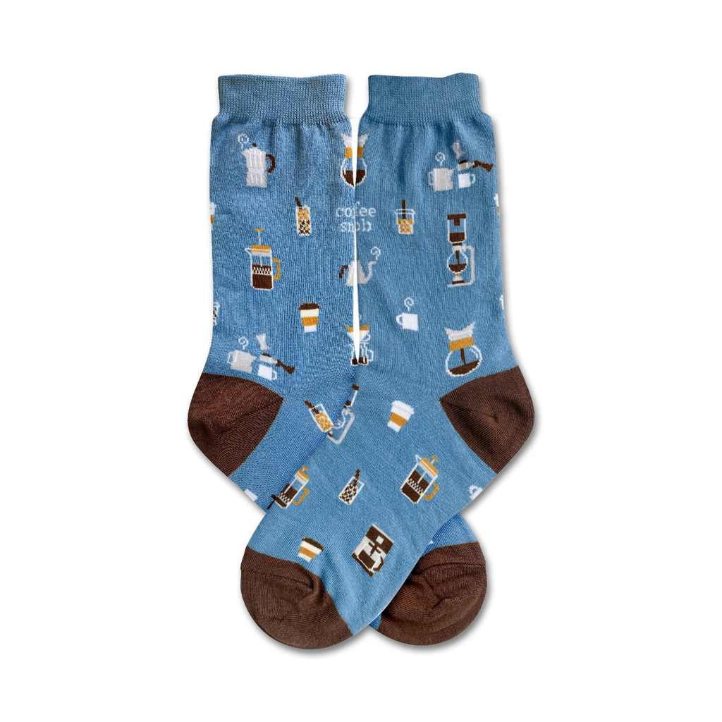 Coffee Snob Crew Socks: Wake up and smell the fashion! These blue crew socks are not just for java lovers, they're a style statement. With coffee beans, mugs and pots in bright shades of coffee and cream, they're sure to perk up your day. They say, "I run on coffee and sarcasm, preferably at the same time!"
