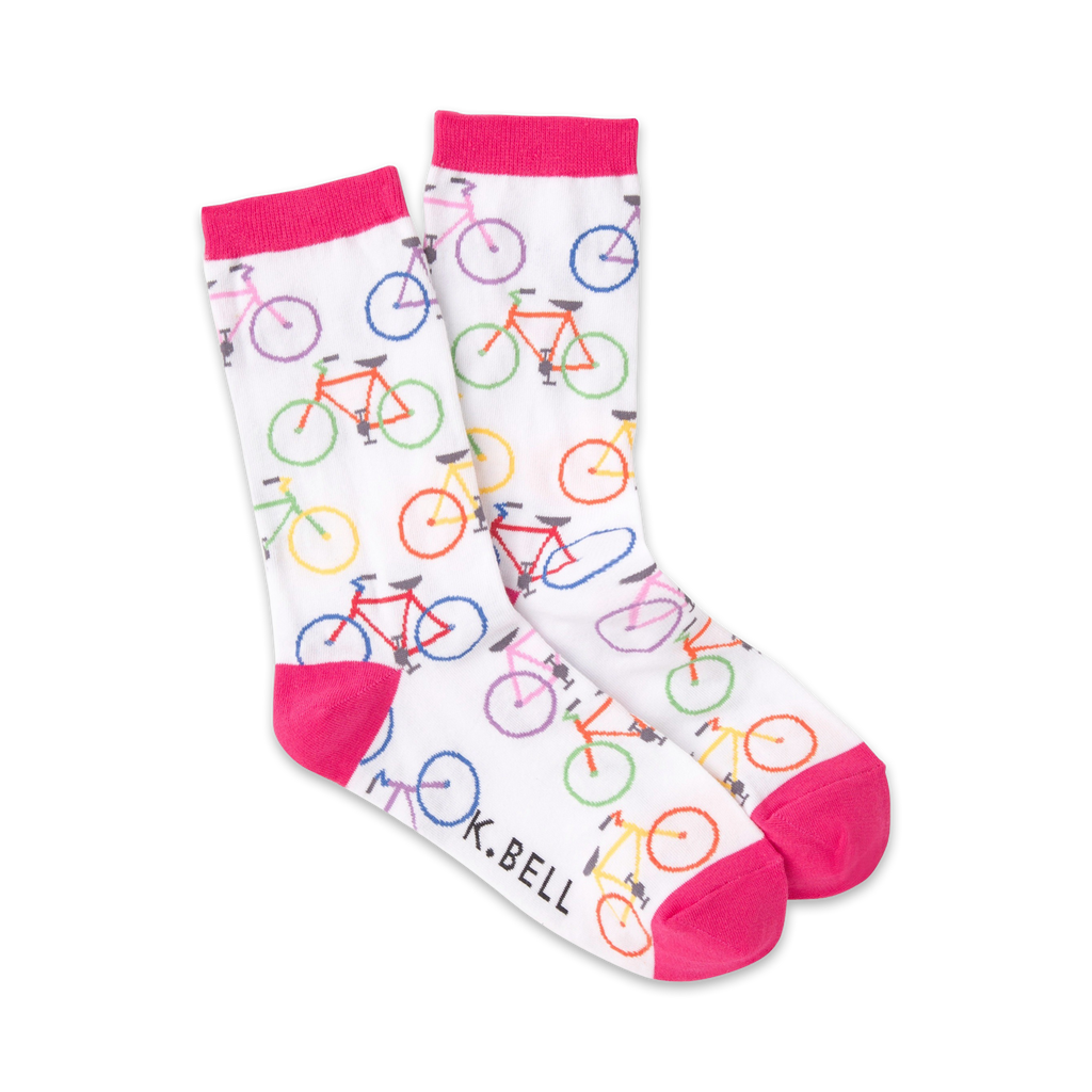 Show them all what kind of trooper you are. When you got places to go, it is no gas, all ass! This cool pair of white and pink crew socks features a pattern of brightly colored bicycles. Buy a pair and wear em'. You'll have a wheely great day!