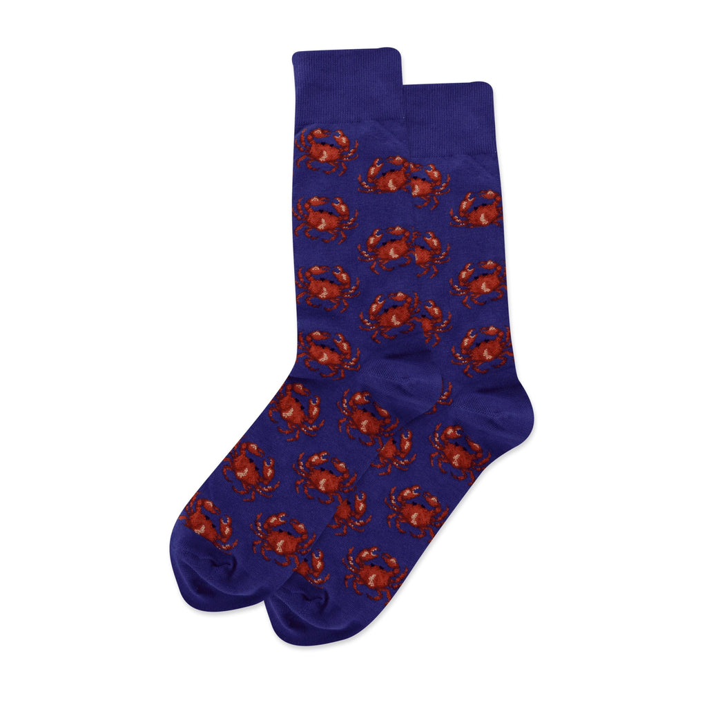 These 'Crabs' socks are a deep purple-blue, covered in a repeating pattern of reddish-brown crabs. The crabs are shown in a fairly detailed style, not just simple outlines. The visible portion of the socks suggests a crew sock length. They're fun and a little quirky- perfect for adding some personality to your footwear.