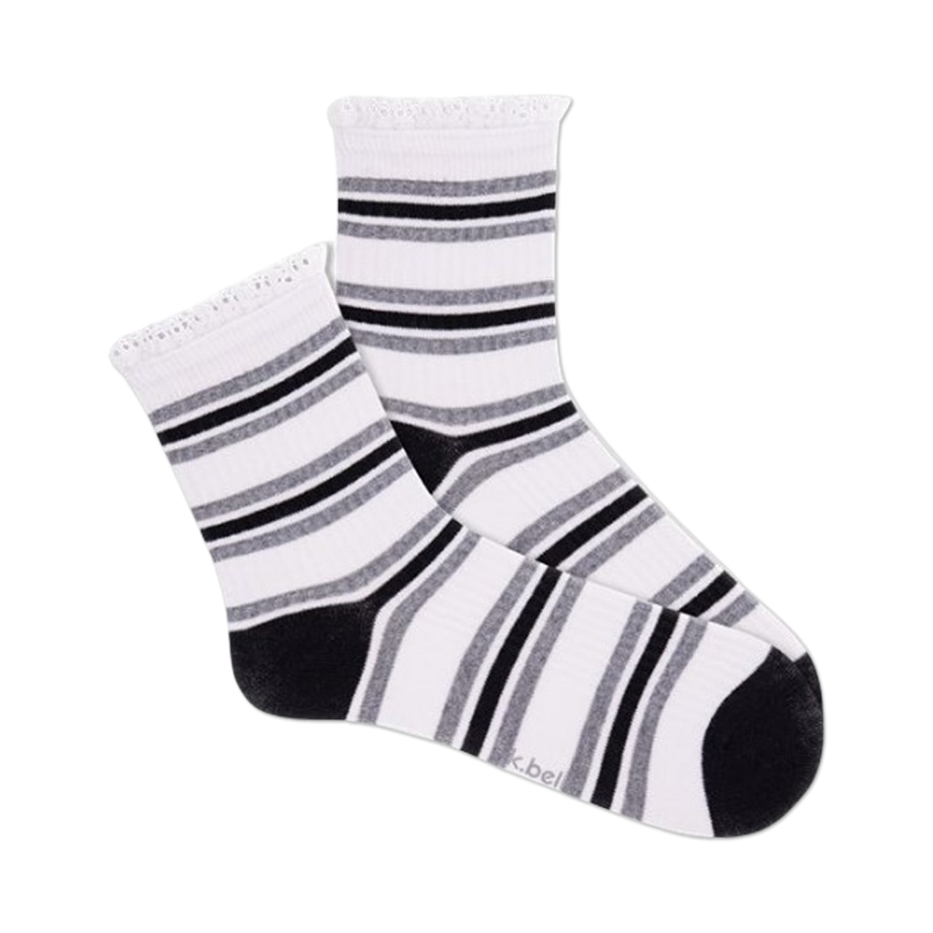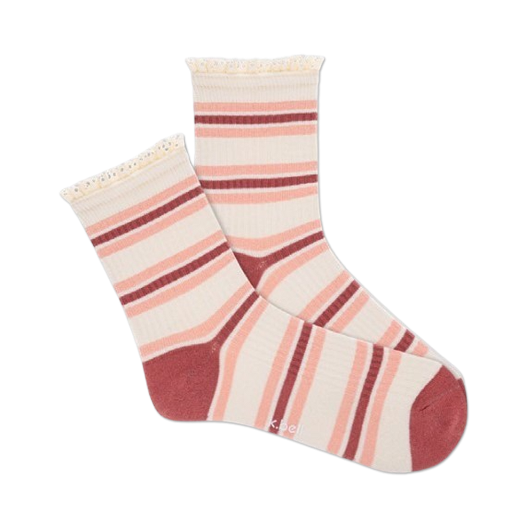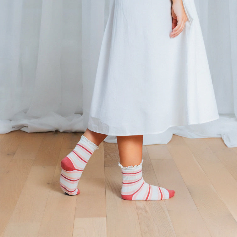 Show off your fashion-forward side with these Crochet Lace Ribbed Quarter Socks! With their white base, thin red stripes, and red cuff, these socks are anything but boring. The ribbed knit fabric adds a touch of texture, while the lace pattern at the top brings a hint of femininity. Whether you're dressing up or dressing down, these socks are sure to turn heads. Fun fact: Did you know that the lace pattern on these socks is inspired by the intricate designs found on crochet lace? Now you can have the beauty of lace without having to do any of the work!