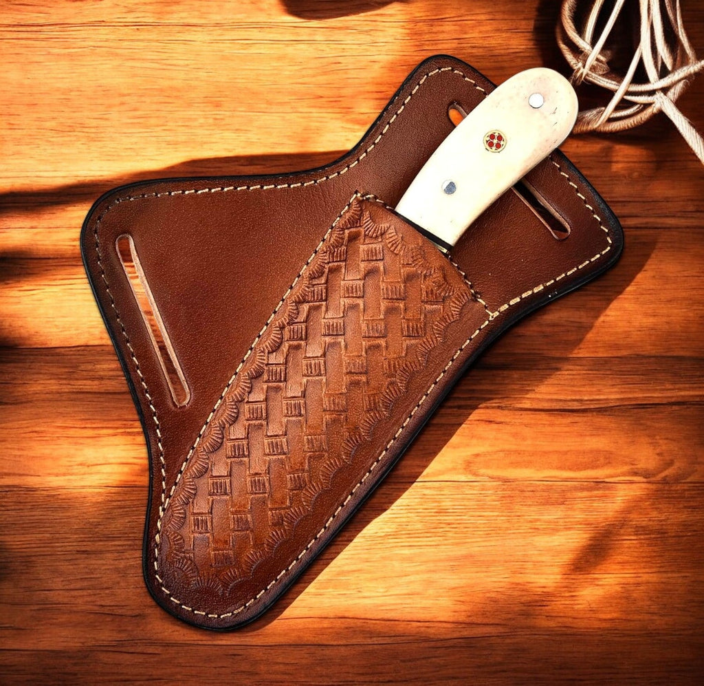 Introducing the Bull Cutter knife, a precision-crafted tool designed for superior performance and style. This custom handmade knife features an overall length of 7 inches, making it the perfect size for precise tasks. Its 3.1-inch full tang Raindrops Damascus steel blade offers unparalleled durability and sharpness, with a striking pattern that enhances its visual appeal. The handle combines bone and rosewood, accented by a sturdy steel bolster, delivering both comfort and control. For convenience and protection, the knife comes with a horizontal leather sheath, allowing for easy carry and access. Ideal for collectors and outdoor enthusiasts alike.