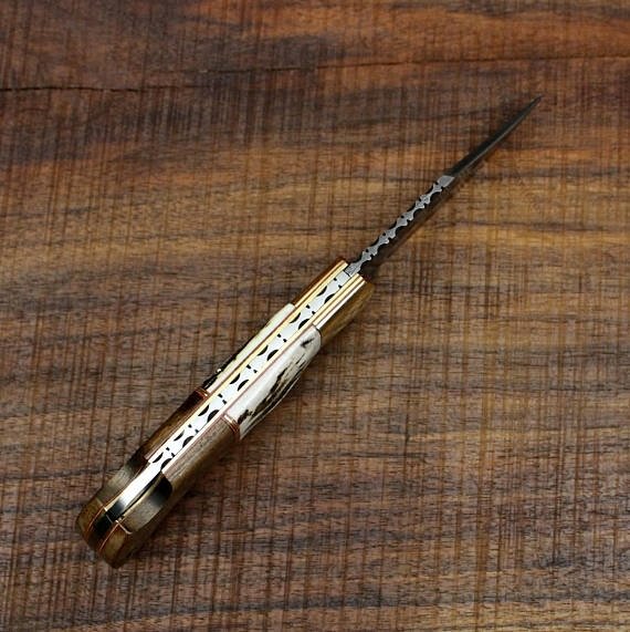 The handle of the knife is made from a combination of rosewood, antler horn, and brass bolster, creating a unique and elegant design. The rosewood handle provides a comfortable grip and a beautiful finish that complements the blade. The antler horn and brass bolster add texture and contrast to the handle, making it both functional and visually appealing.