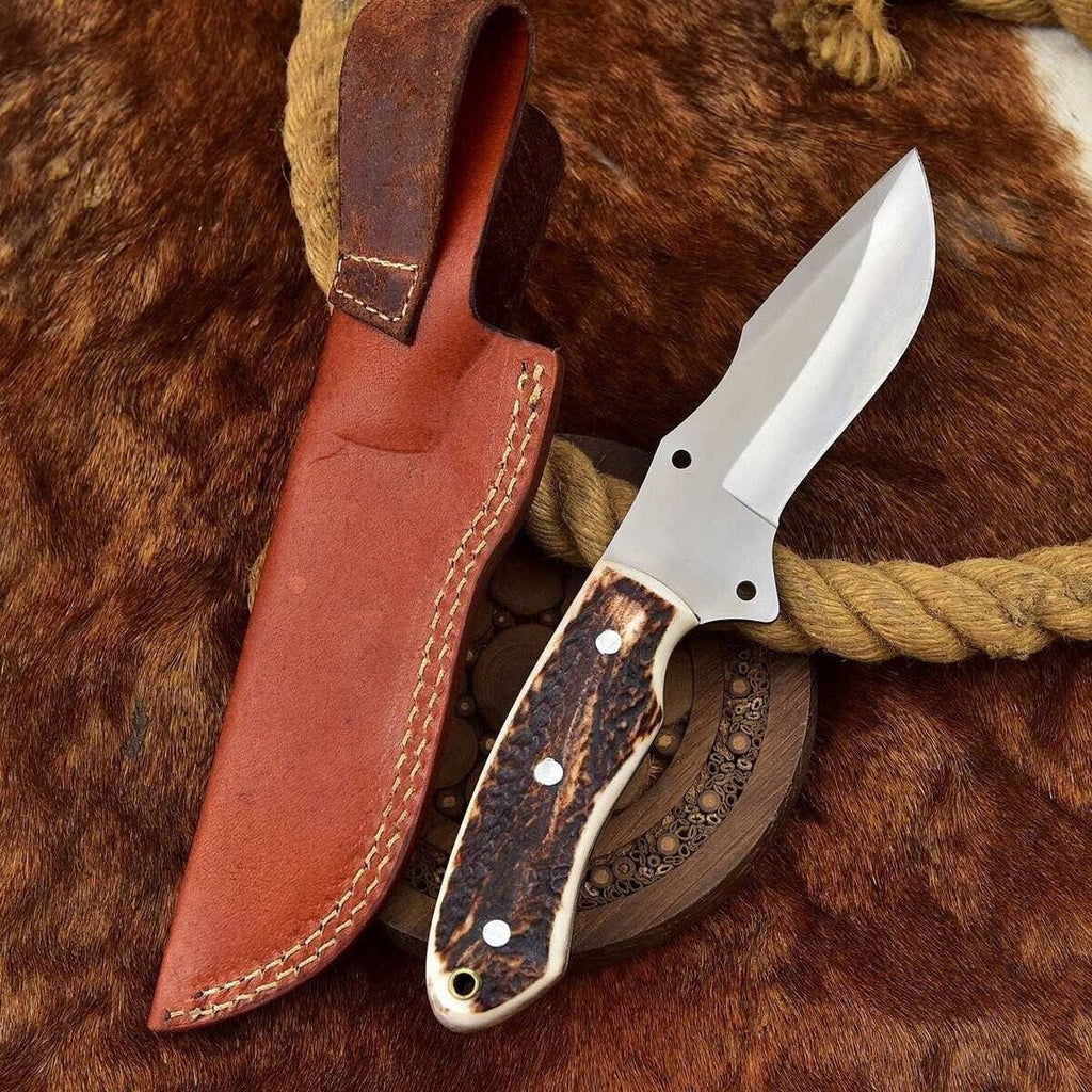 Experience precision and quality with our custom handmade good skinning knife, expertly designed for hunters and outdoor enthusiasts. With an overall length of 7.75 inches and a blade length of 3.75 inches, this knife is perfectly balanced for effortless skinning and processing. Crafted from full tang D2 steel, the blade offers exceptional durability and sharpness, ensuring it withstands the rigors of any task. The handle, made from natural antler horn, provides a secure and comfortable grip, making it ideal for extended use. Each knife comes with a premium leather sheath, ensuring safe storage and easy access during your outdoor adventures.