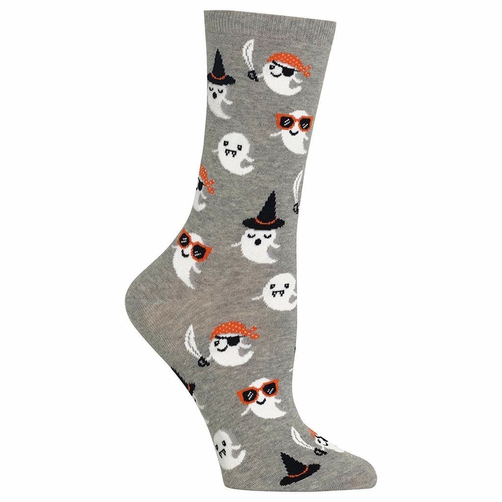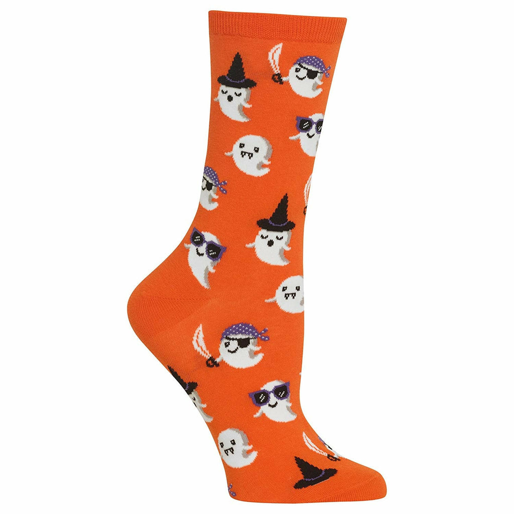 Check out these Cute Ghost socks! They're bright orange with a pattern of adorable little ghosts. Some ghosts are wearing pirate eye patches and hats, others sport sunglasses. It's a fun, spooky, and totally charming design. The socks shown are crew socks, and the orange color is really vibrant. These are perfect for Halloween or anytime you want to add a touch of playful whimsy to your outfit. They're comfy too - we promise!