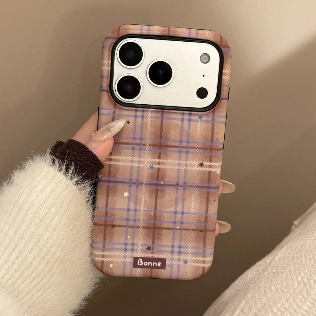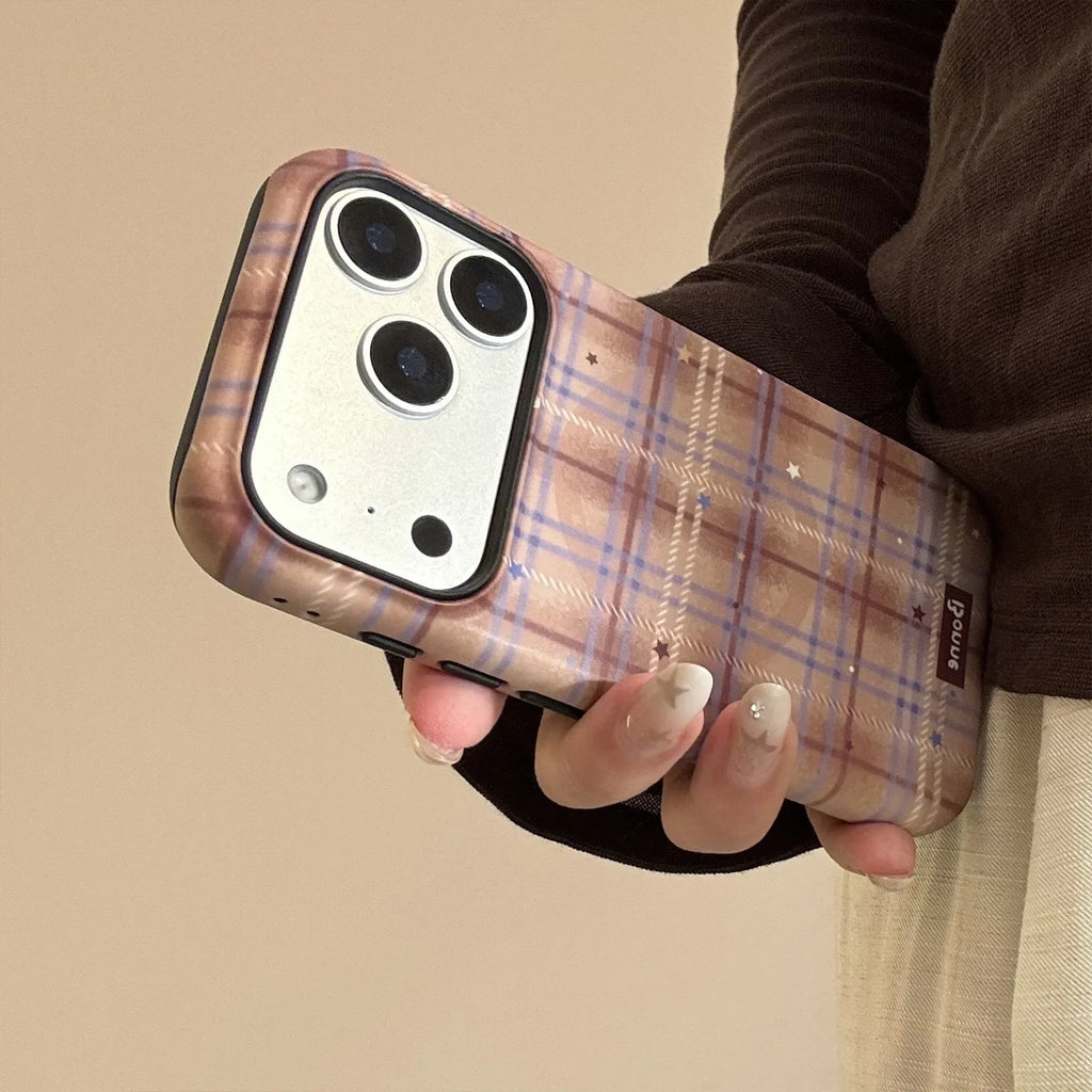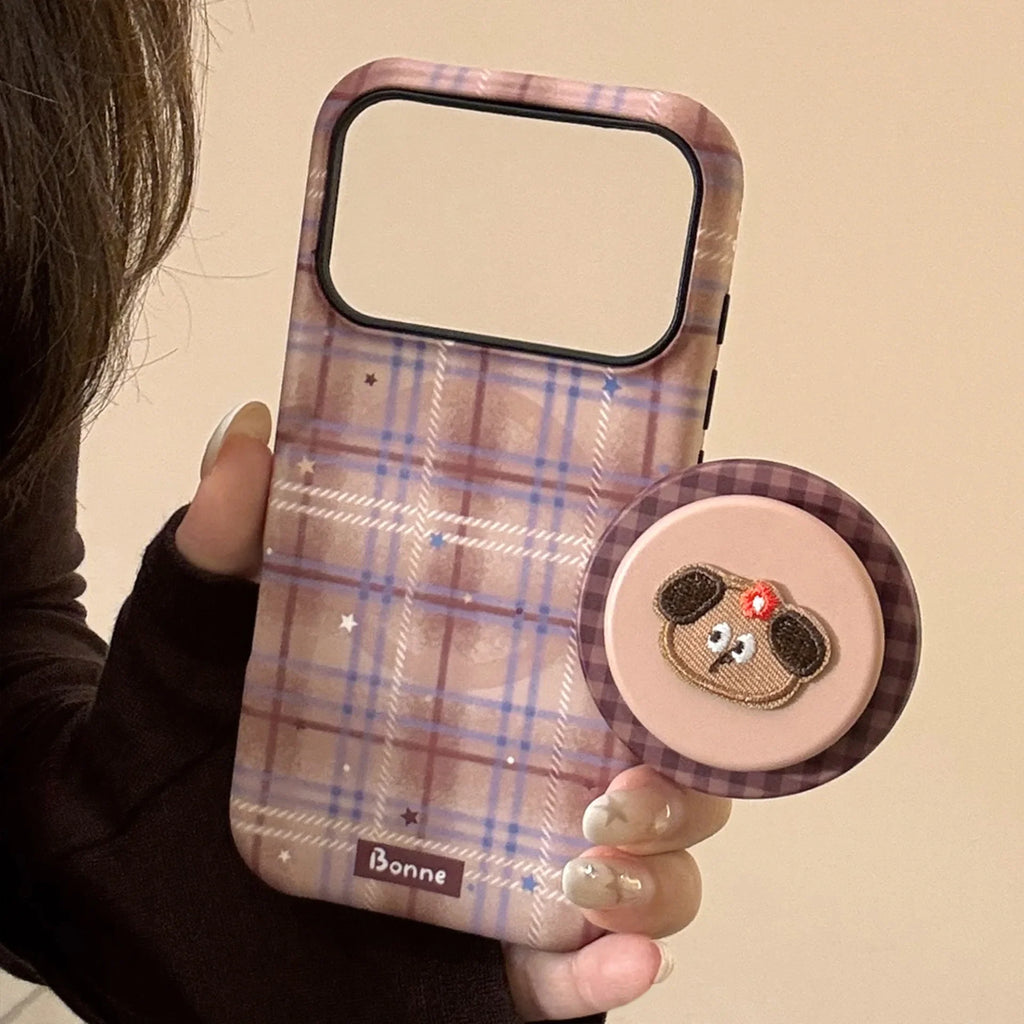 Protect your iPhone with playful style using this adorable grid pattern phone case featuring charming cartoon puppy embroidery. The built-in magnetic bracket lets you prop up your device hands-free for video calls, streaming, or content creation. Durable construction shields against drops and scratches while the eye-catching design brings personality to your everyday carry. Perfect for puppy lovers and anyone seeking functional protection that doesn't compromise on charm.