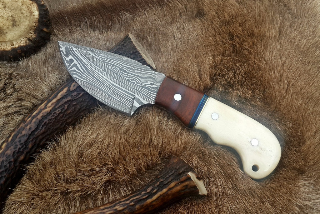 Introducing the Damascus Steel Drop Point Skinning Knife, designed for optimal performance in field dressing. This knife features an overall length of 7 inches, with a 3-inch Damascus steel blade that ensures exceptional sharpness and durability. The drop point blade design provides versatility and control, making it perfect for various cutting tasks. The handle, crafted from bone and rosewood, offers a comfortable grip and an elegant aesthetic, making this knife a must-have for any hunting enthusiast.