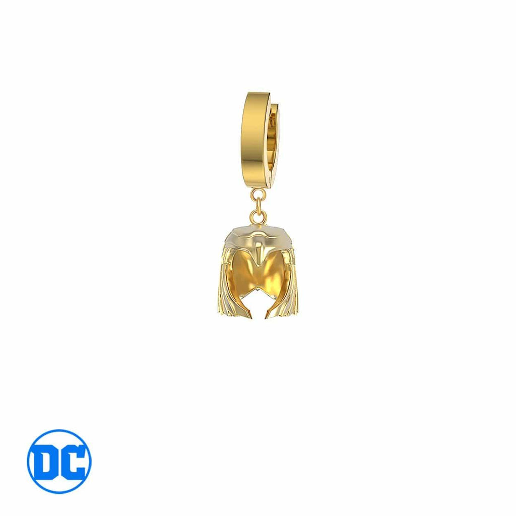 The Golden Armor Earring has a hinged hoop earring (20 GA) and is made from high-grade Stainless Steel. Features a 3D-style Golden Armor Helmet pendant at 1/2" tall x 3/8" wide.