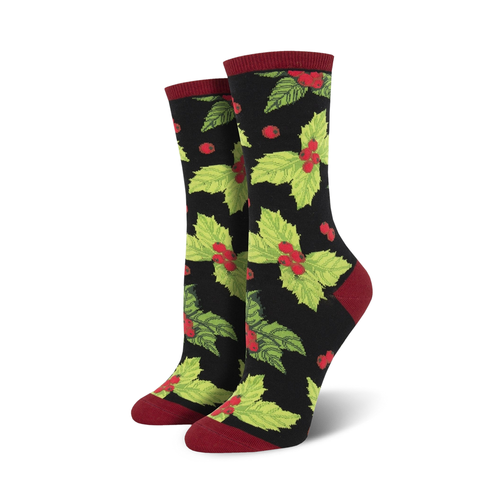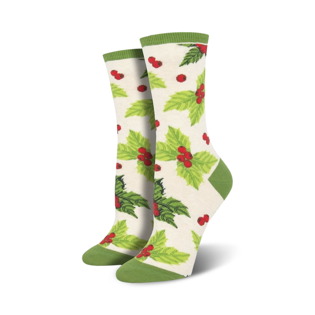 Yule love spreading holiday cheer with these festive socks. With green holly leaves and red berries on a white background topped with a green cuff, these socks are jolly fun. Just like the carol goes, the halls will be decked when you wear these Christmas-themed socks. The durable material makes these socks perfect for prancing around under the mistletoe or making a dashing run through the snow.