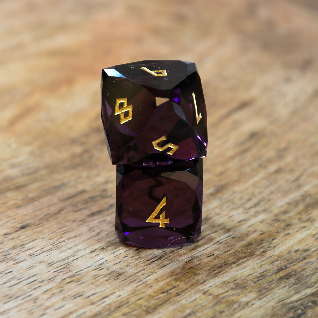 Each die is hand-cut from zircon prism glass, sanded, and polished. Designs are then engraved into each side and hand painted. Glass dice are known to have a well balanced weight due to the lack of air bubbles inside the glass. The multifaceted cut gives the dice more refraction and shine!