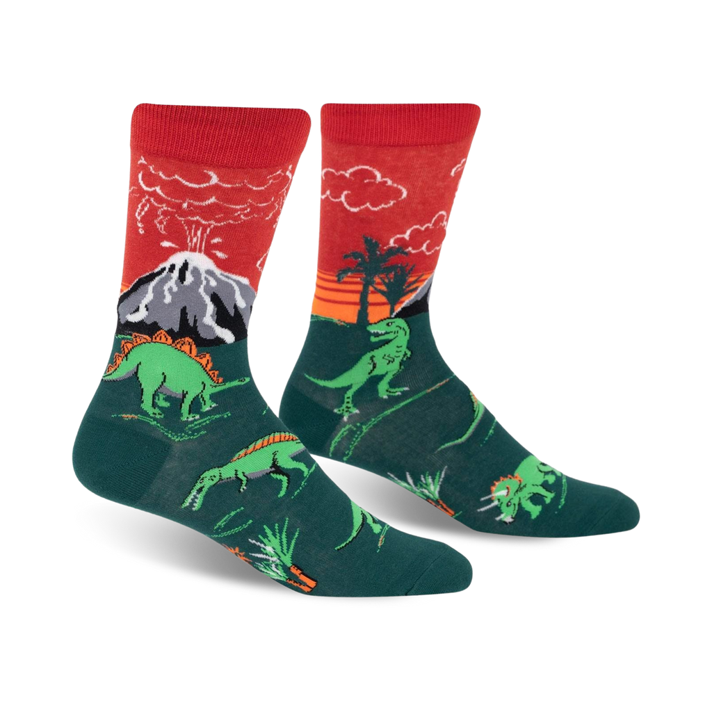 Dinosaur Days Glow socks feature a gray, brown, and green trio of dinos set against a backdrop of lush green grass, vibrant yellow flowers, a glowing red sun, and a puffy white cloud. Get ready to stomp through your day with a smile on your face and a prehistoric pep in your step. The perfect addition to any dinosaur enthusiast's sock drawer.