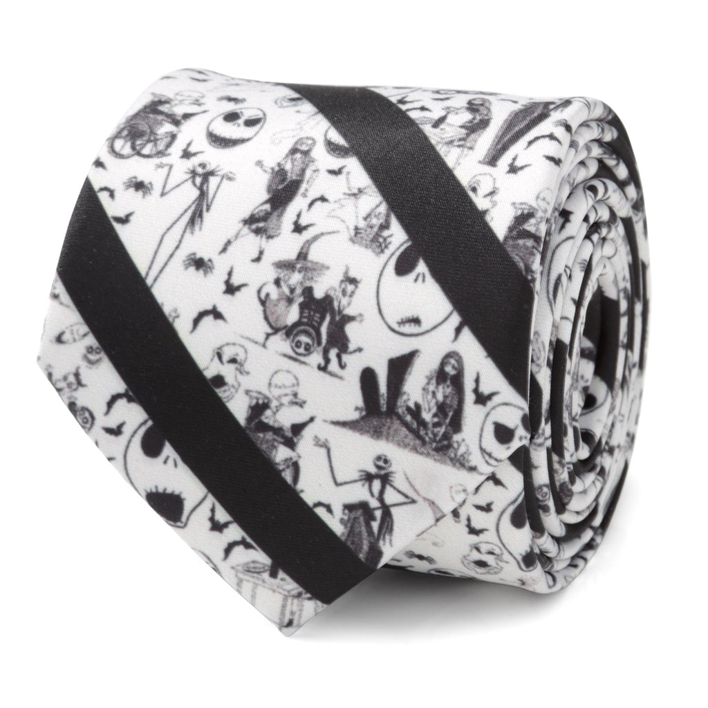 Perfect for Halloween, Christmas, or just the lover of everything spooky, this Nightmare Before Christmas tie will have you festive and frightening at the same time. From Jack Skellington all the way down to Oogie Boogie, this black striped tie is printed with recognizable scenes and symbols from the film. You'll be dying to wear it for any occasion. Officially licensed by Disney.