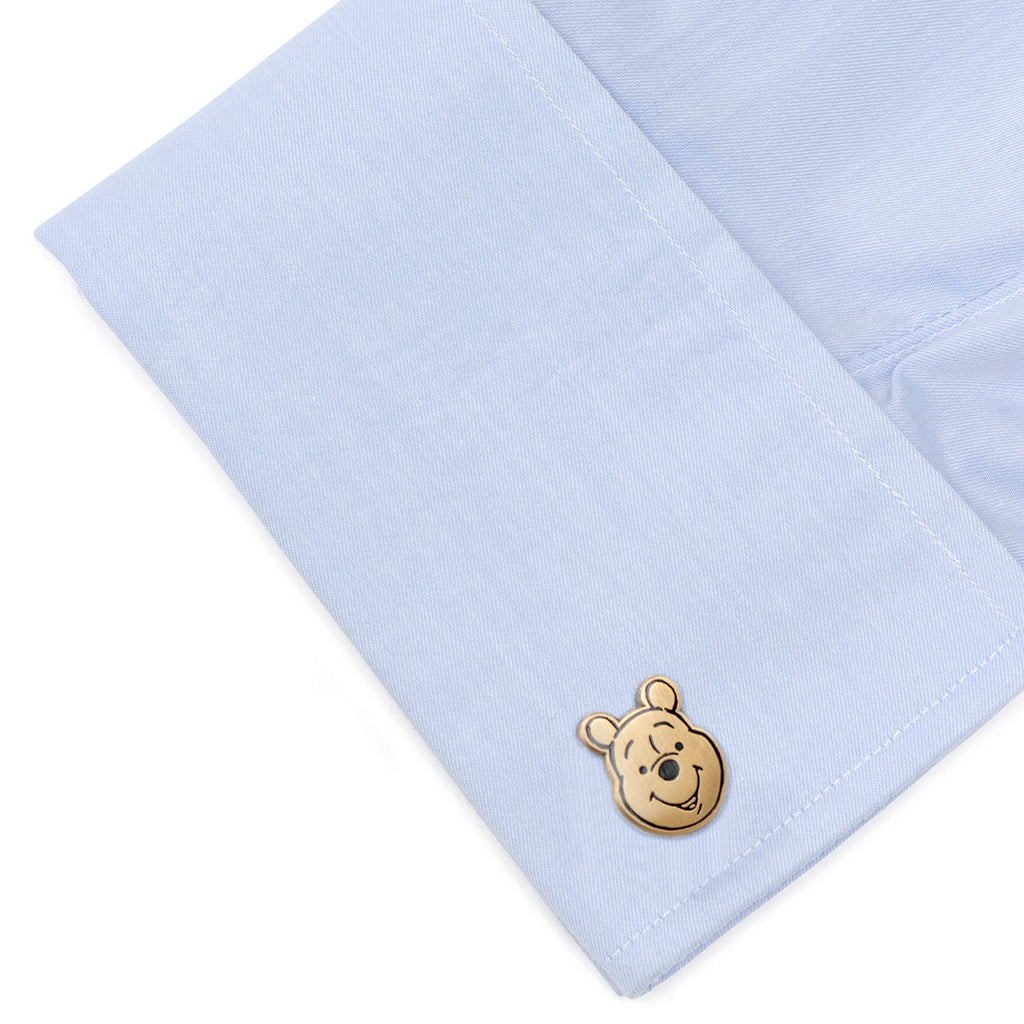 Our Winnie The Pooh Face Gold Cufflinks feature the happy, smiling face of Winnie the Pooh. Since our favorite bear from the Hundred Acre Wood can't be far from his beloved hunny pot, the fixed round backing is emblazoned with Pooh's favorite treat. Experience enchantment with our expertly crafted plated base metal cufflinks. They are built to last, infused with Disney magic, and ready to accompany you on whimsical adventures. Pairs well with our plaid Winnie the Pooh tie. Officially licensed by Disney.