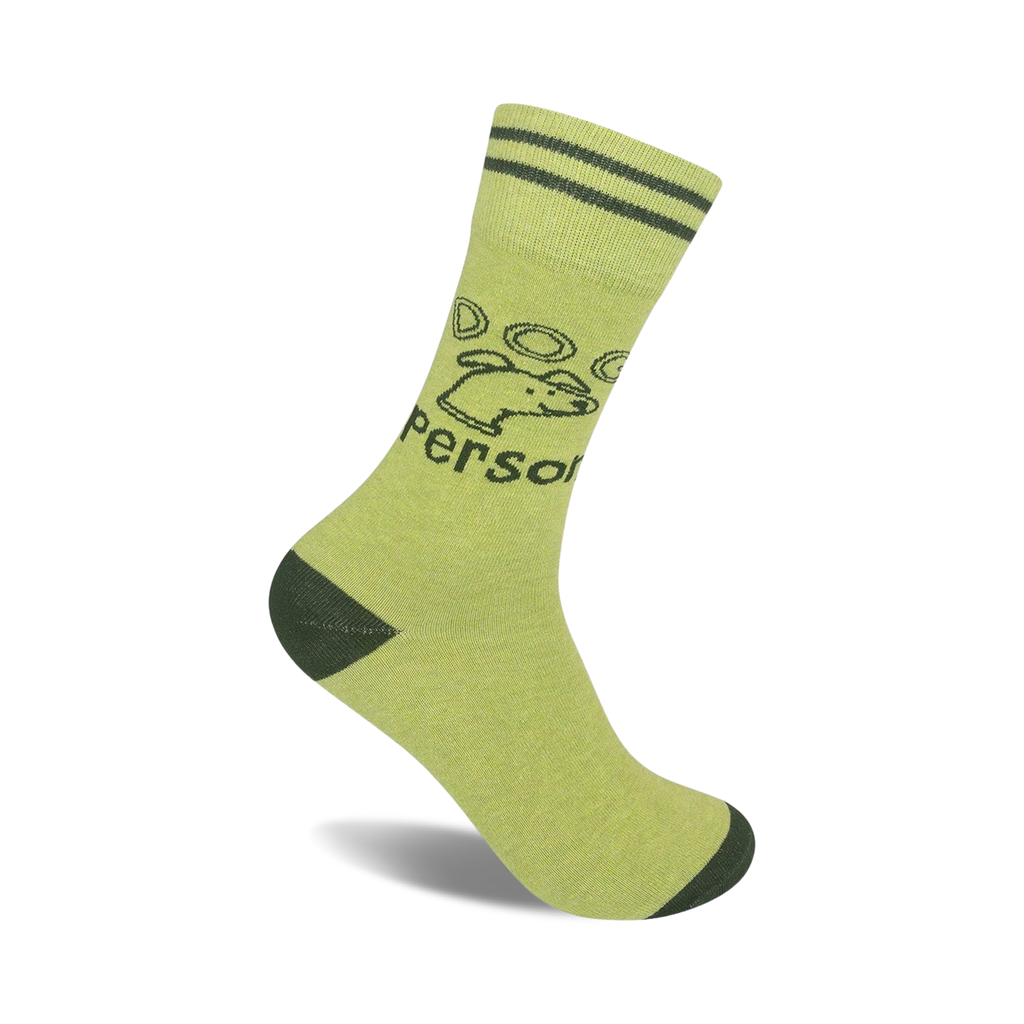 Unleash your inner canine companion with our 'Dog Person' socks! These paw-some crew socks are made for those who live life on the leash. With their light green background, dark green 'Dog Person' text, and paw print, these socks will have you howling with delight. The two dark green stripes near the top add a touch of sophistication, making them the perfect accessory for any dog lover.