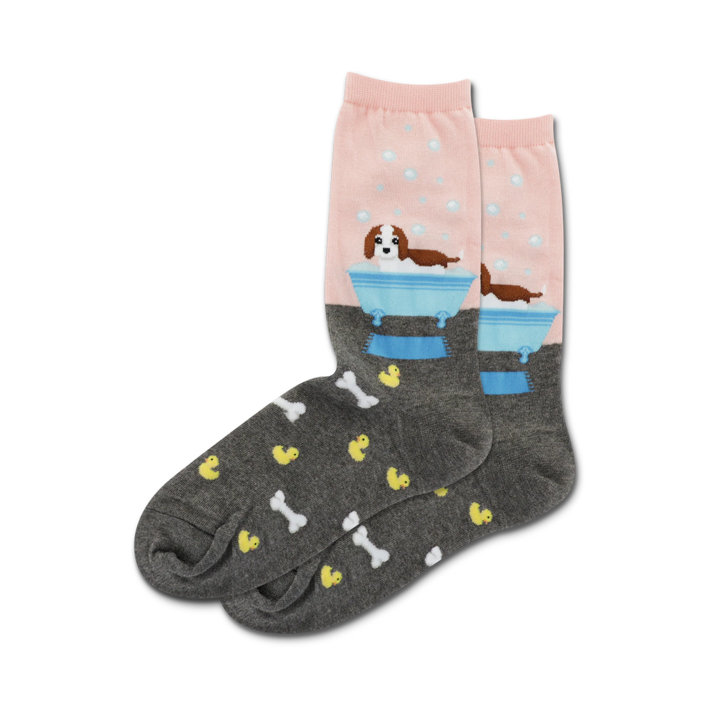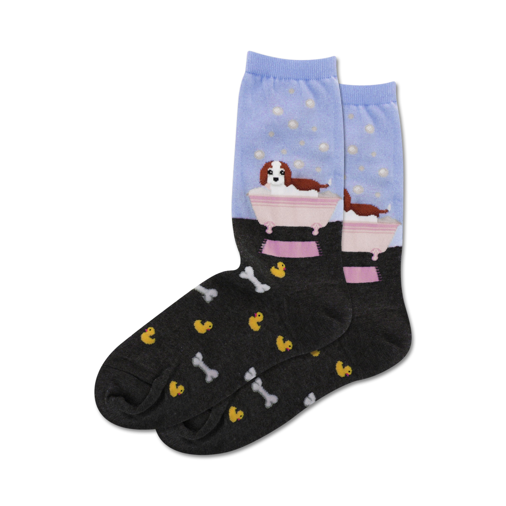 Who let the dogs out? Doggie Bath Time socks let you take your furry friends wherever you go. Don't worry if they get dirty, they're machine washable! These crew length socks feature a pattern of yellow rubber ducks and bones on the black part of the socks with a bathtub with a dog in it on the blue part. They're cozy, comfortable, and stylish. You won't want to take them off, even after bath time is over.
