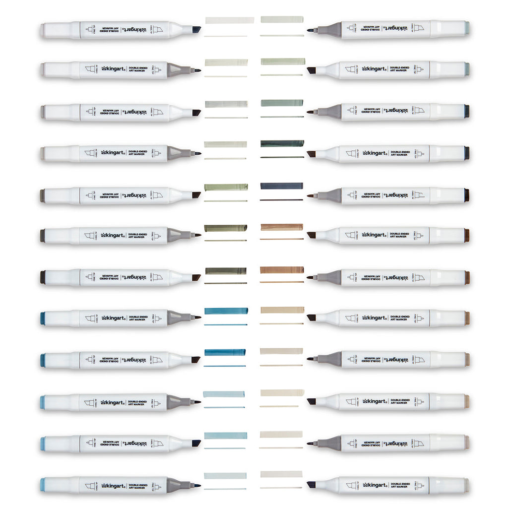 Broad strokes or fine lines, you choose with KINGART® PRO Double-Ended Art Markers. Our Pro Level alcohol-based inks are richly saturated for brilliant color, smooth blending and consistent ink flow. Grey color palette is ideal for tonal drawings, technical illustration and adding shading or muting or any piece.
