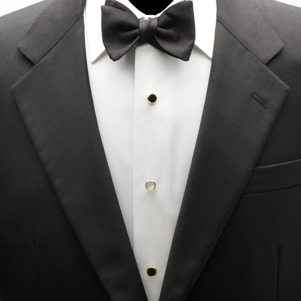 The Double Sided Gold Onyx and Mother of Pearl Round Studs feature a reversible design and can be worn with either Mother of Pearl or Onyx on the front side. Classic in shape with a beveled edge for a sophisticated look for your black tie event. Gold plated base metal with fixed closure.