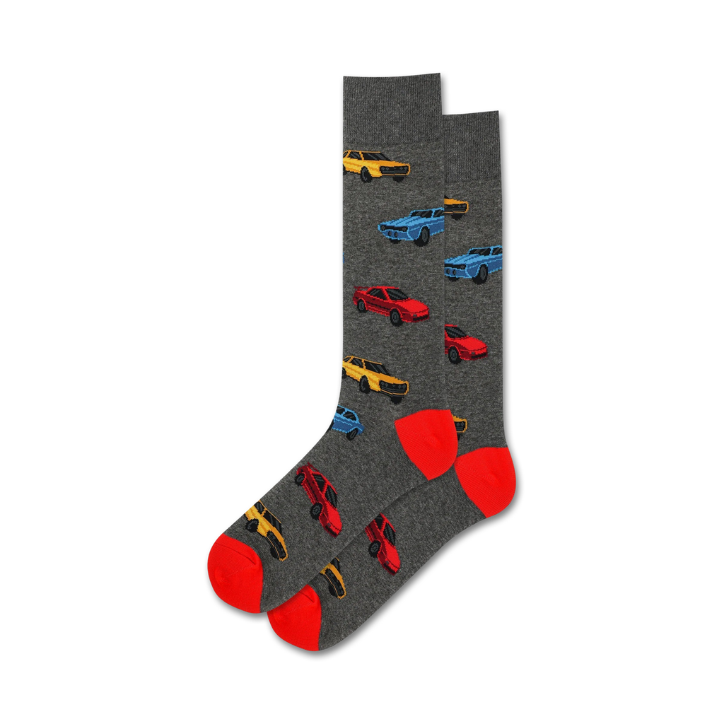 Sure, here is a fun 50-80 word description for novelty socks: Time to cruise down memory lane, sock style! Our Eighties Cars socks are adorned with groovy 1980s sports cars in electric hues of red, blue, and yellow. Just looking at these socks will bring on a blast from the past, like instantly becoming Marty McFly and wanting to rock out with Doc Brown. Wear your love for the totally awesome decade on your toes! These socks are guaranteed to turn people's heads and get you into the "fast lane" of conversations.