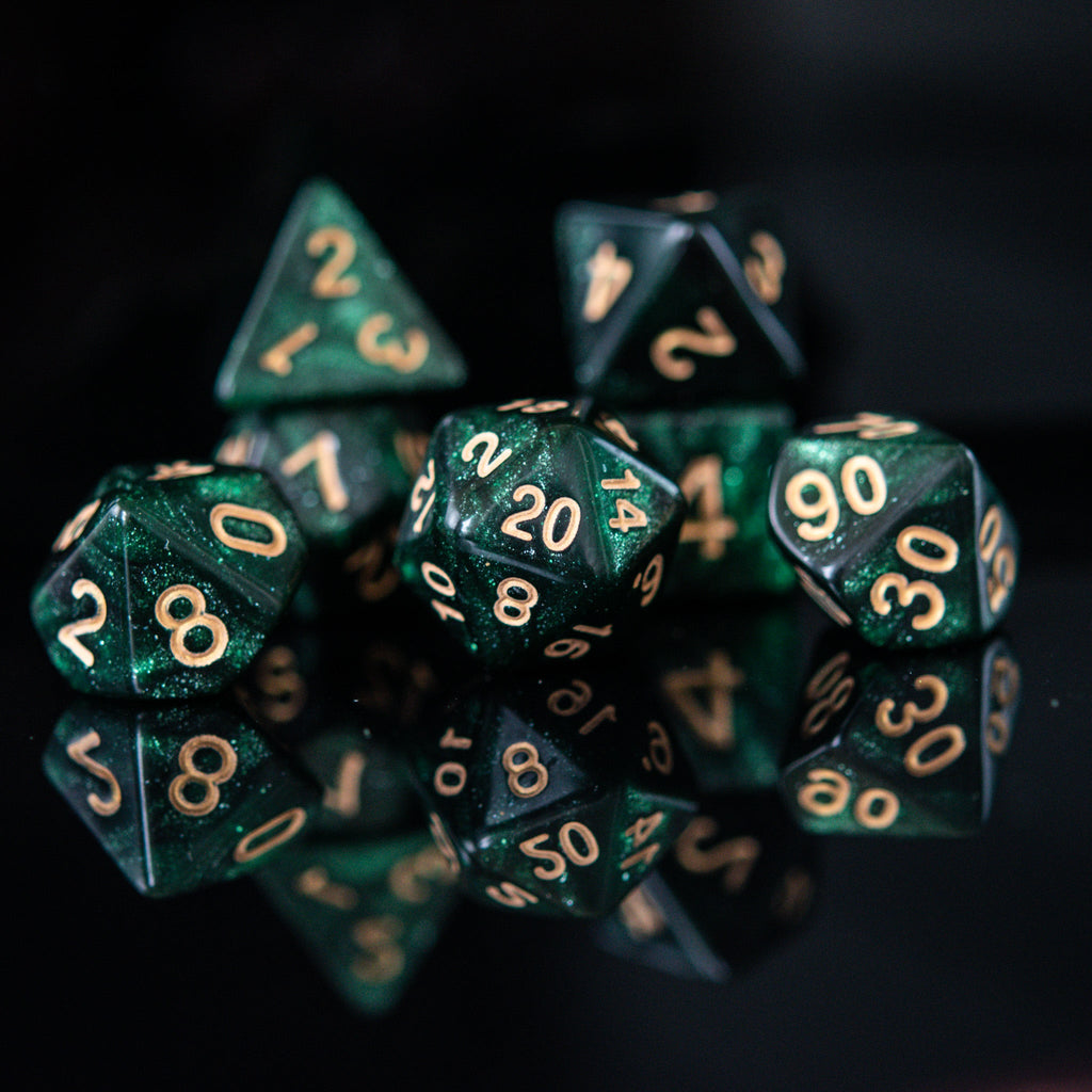 Our acrylic dice are carefully poured into individual molds and cured inside a vacuum chamber to insure no air bubbles are trapped inside the dice. After curing, each individual die is removed from the mold and numbers are painted by hand. These dice are perfect for any RPG and will sure to impress at your upcoming session!