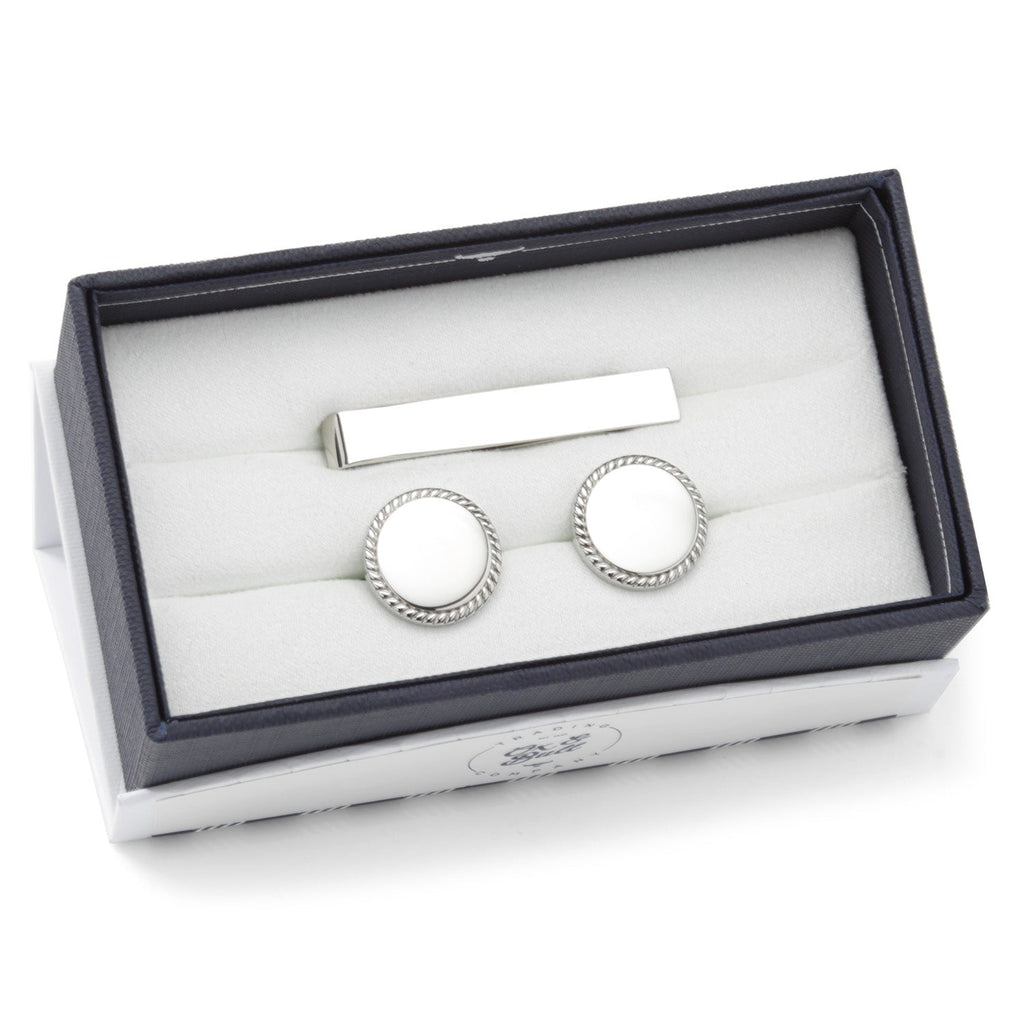 Whether you're buying for yourself or someone else, this gift set of stainless steel engravable cufflinks and tie bar is an essential addition to any collection. Rope edging adds a touch of elegance to the round cufflinks, and the sleek styling of the silver tie bar makes both pieces versatile and wearable to any formal event.