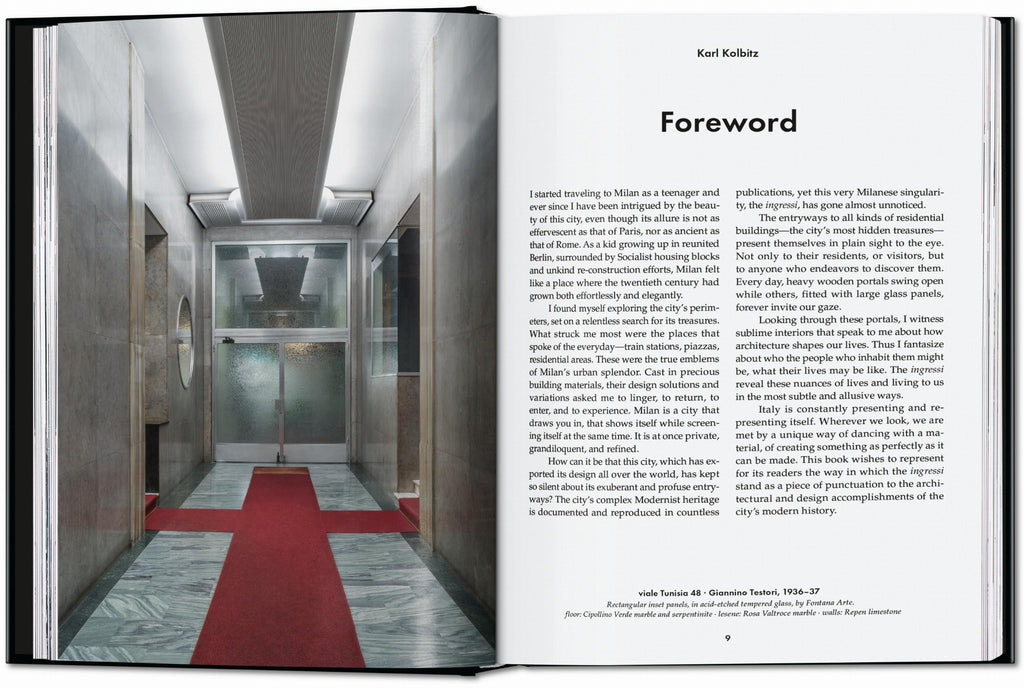 First impressions count, especially in Milano. In this unprecedented photographic journey, editor Karl Kolbitz curates 144 of the finest Milanese entrance halls from 1920 to 1970. Sumptuous in diversity and splendor, the volume features some of Milan’s most famous architects and showcases the city’s design DNA across high to low architecture.