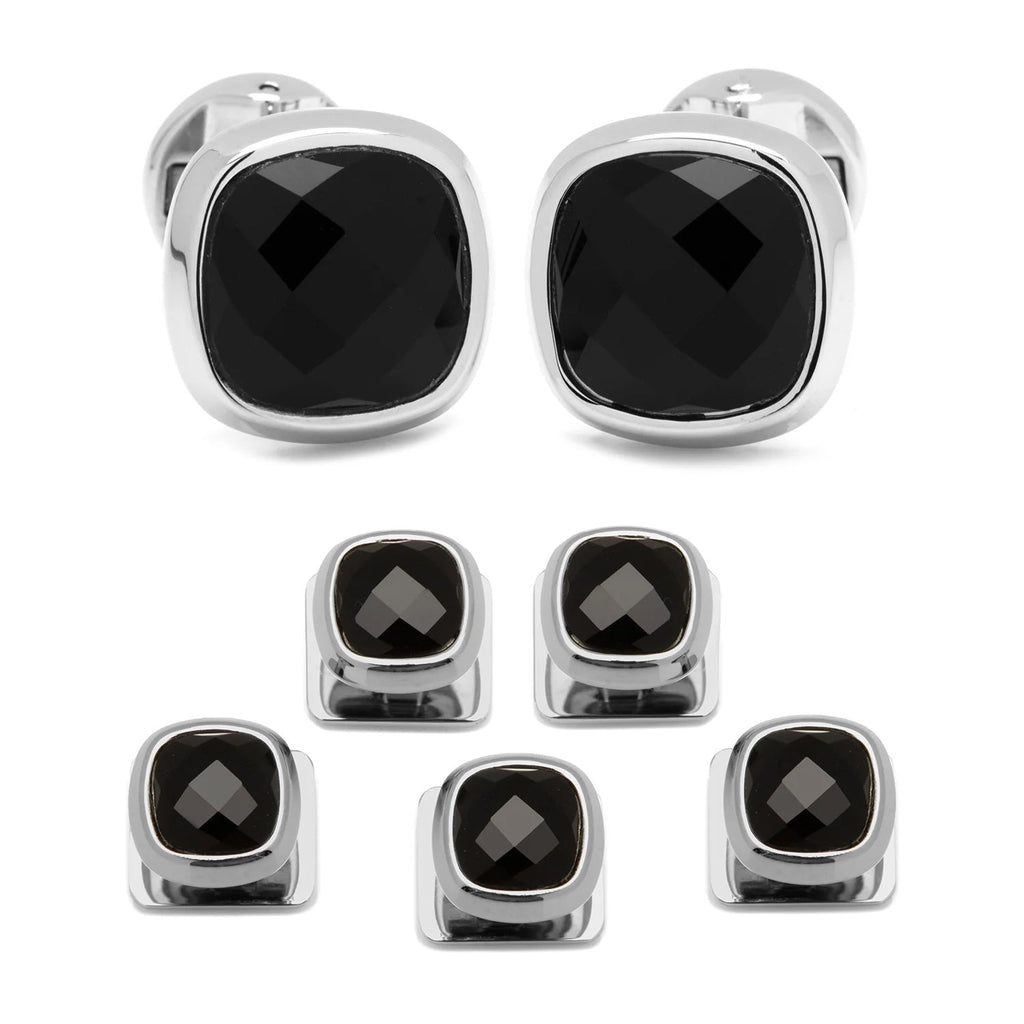 Upgrade your black tie look with the Faceted Onyx Cushion Stud Set, featuring genuine onyx stone set in stainless steel with a beautiful faceted cut. The compliments you will receive will bring out the sparkle in your eye. Be the center of attention at your next formal event for all the right reasons.