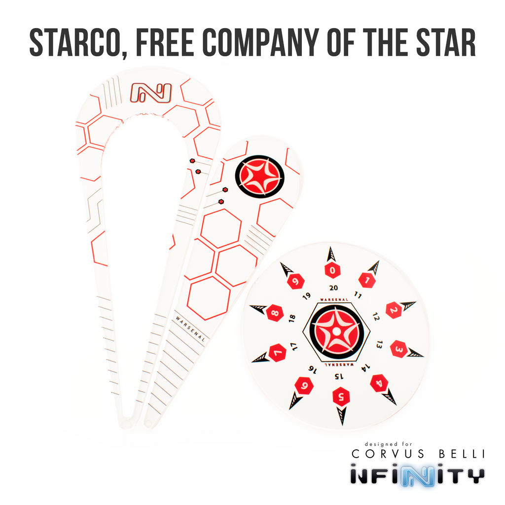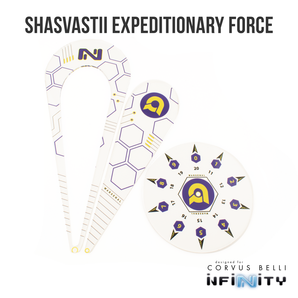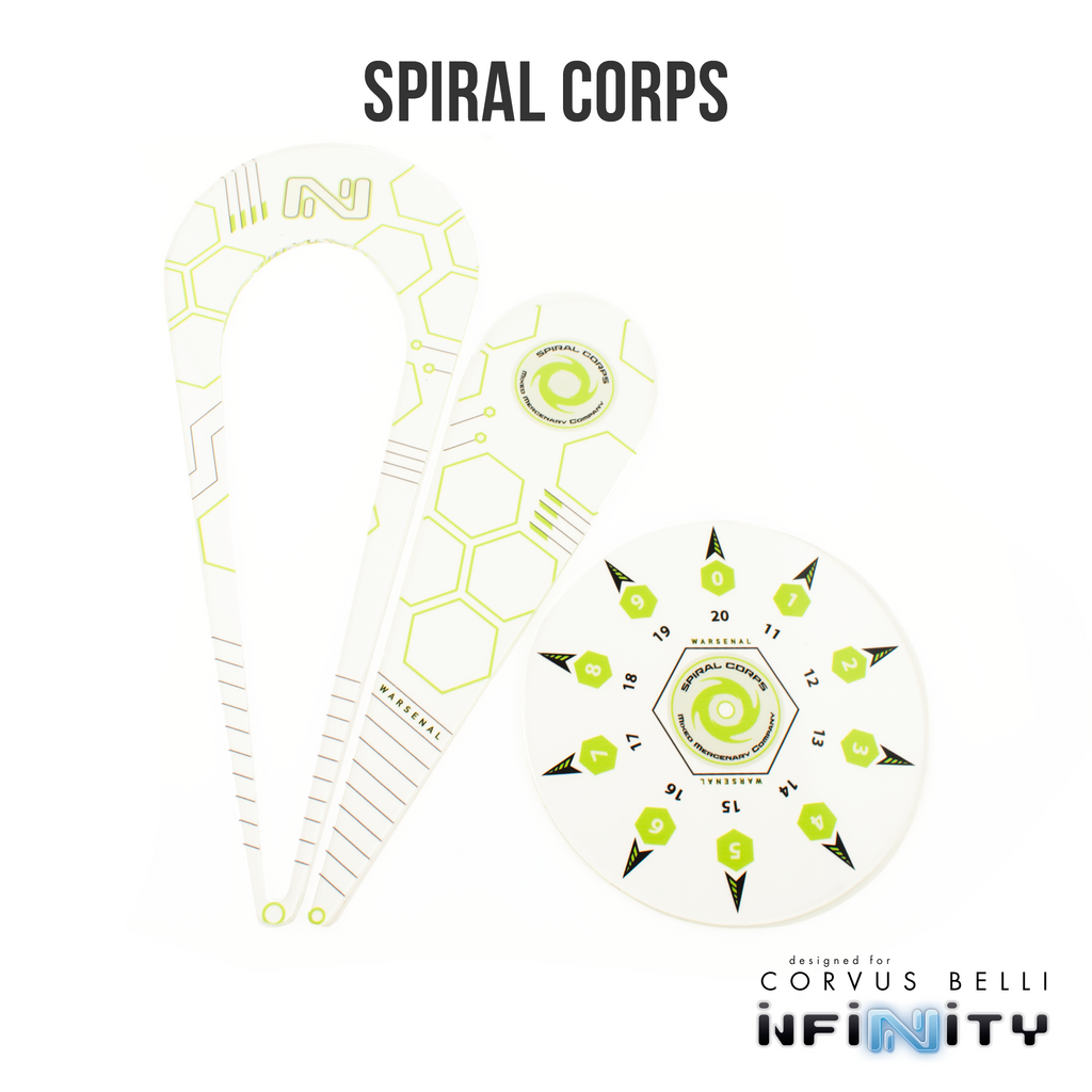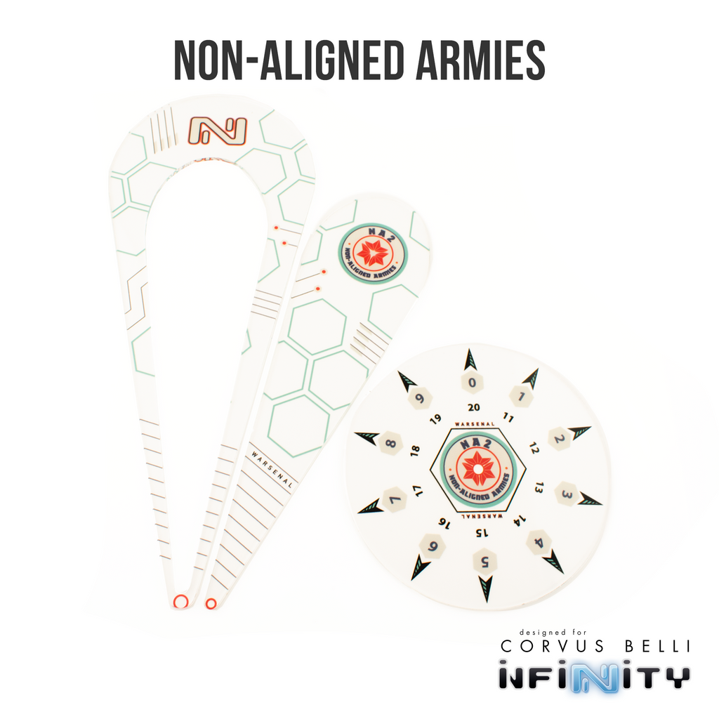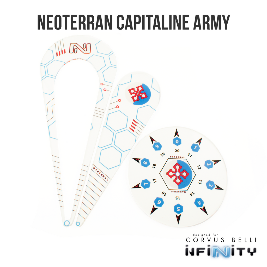 All the templates you need to play Infinity: the Game, emblazoned with the faction logo of your choice!