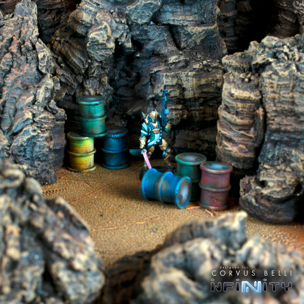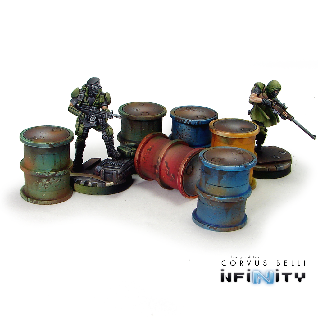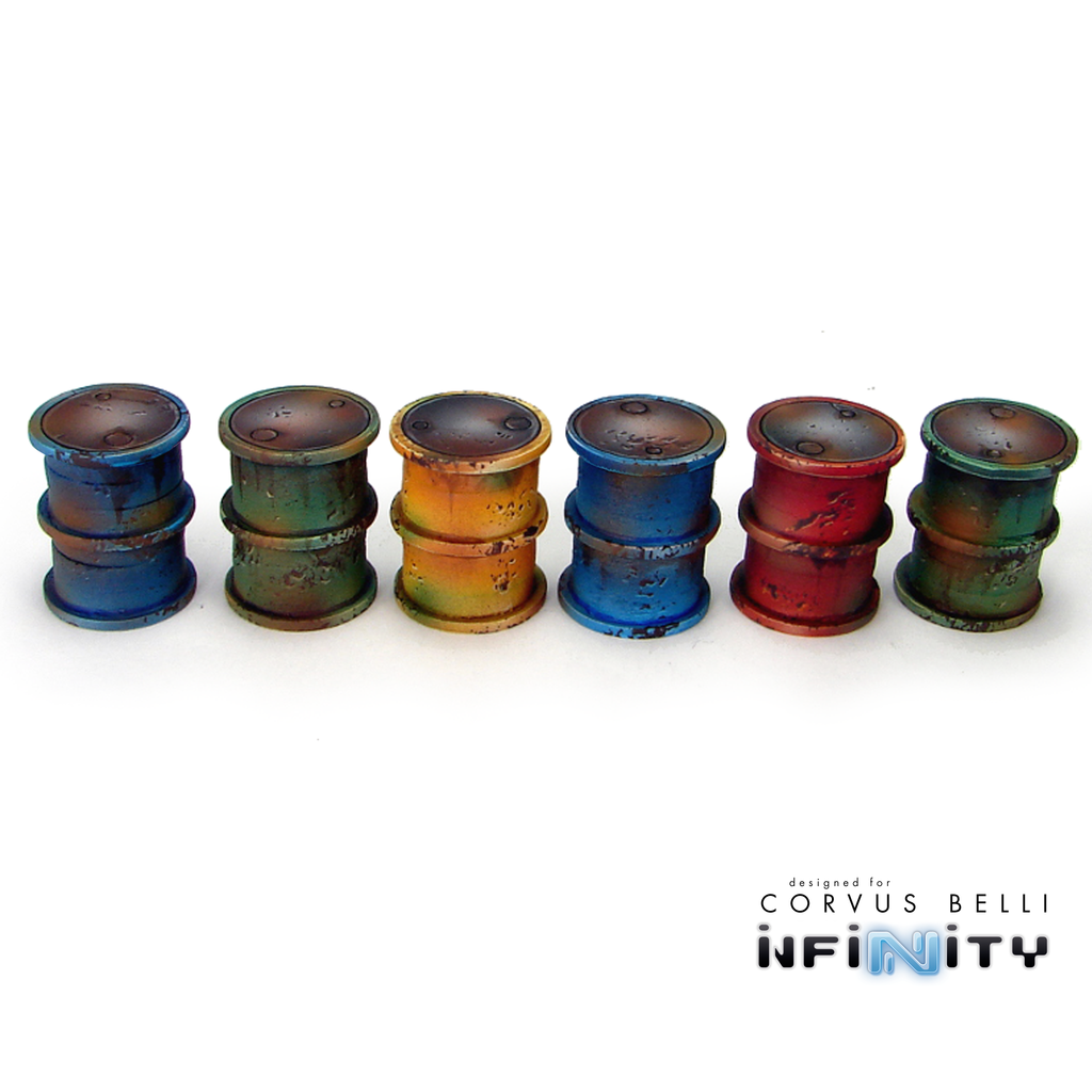 This product contains one set of 6 Fuel Drums. Great scatter terrain for Infinity the Game or any 25mm - 32mm table top miniatures game.