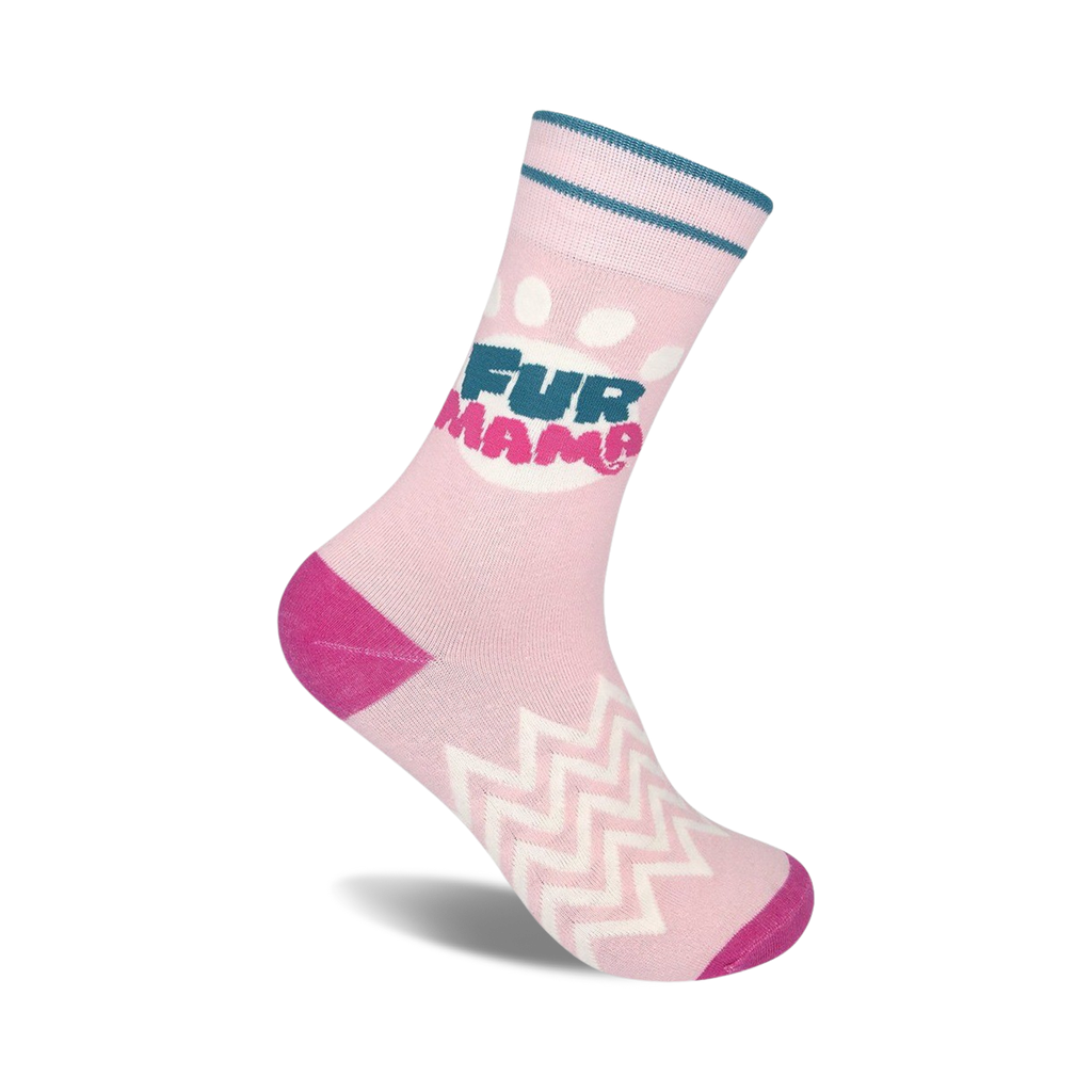 Calling all fur mamas! These pink crew socks feature a striking white and blue zigzag pattern and a blue toe and heel. Boldly displayed on the front of the sock is 'Fur Mama' in a blue circle with a pink paw print. Show the world your love for your furry friend with these comfy, stylish socks!